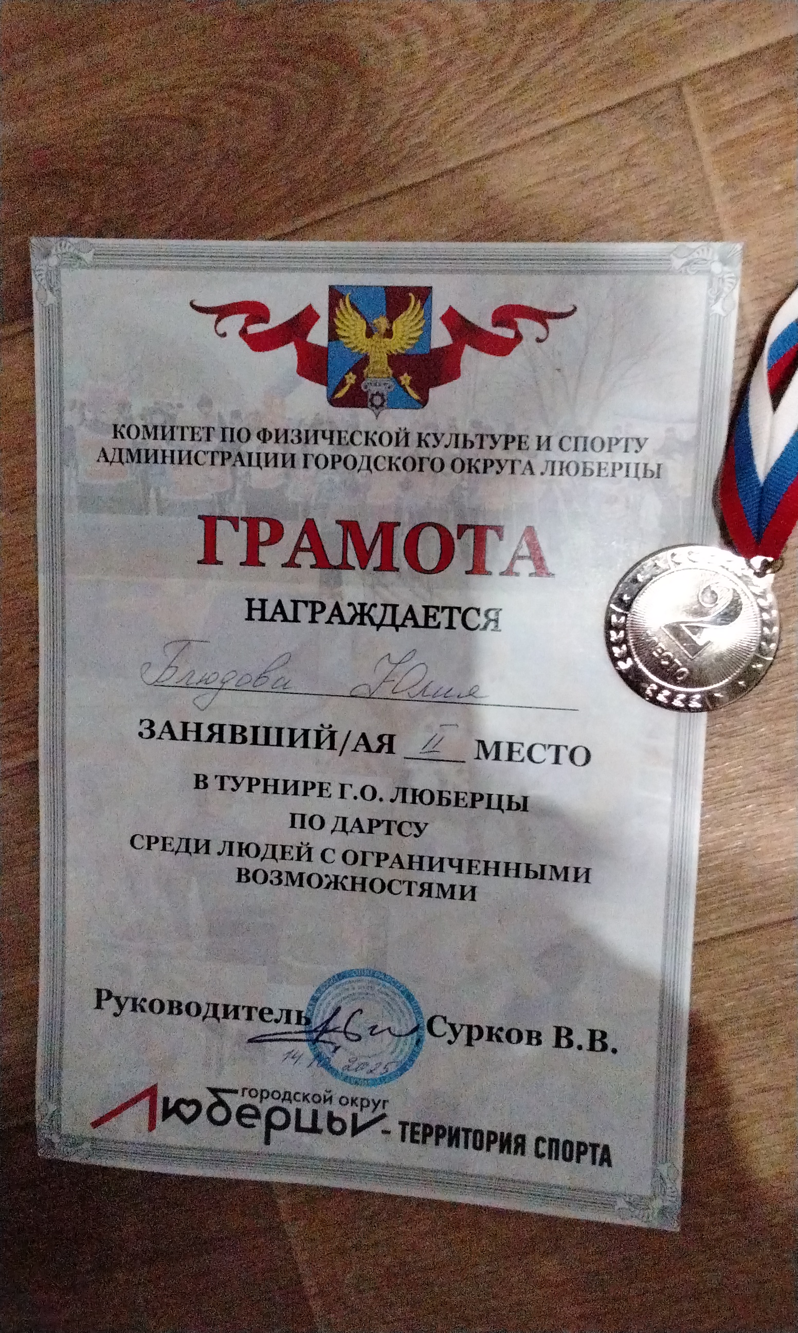 Чемпионат городского округа Люберцы по дартсу среди лиц с ОВЗ. Грамота за 1 место по дарсу. 5.10.2021г.