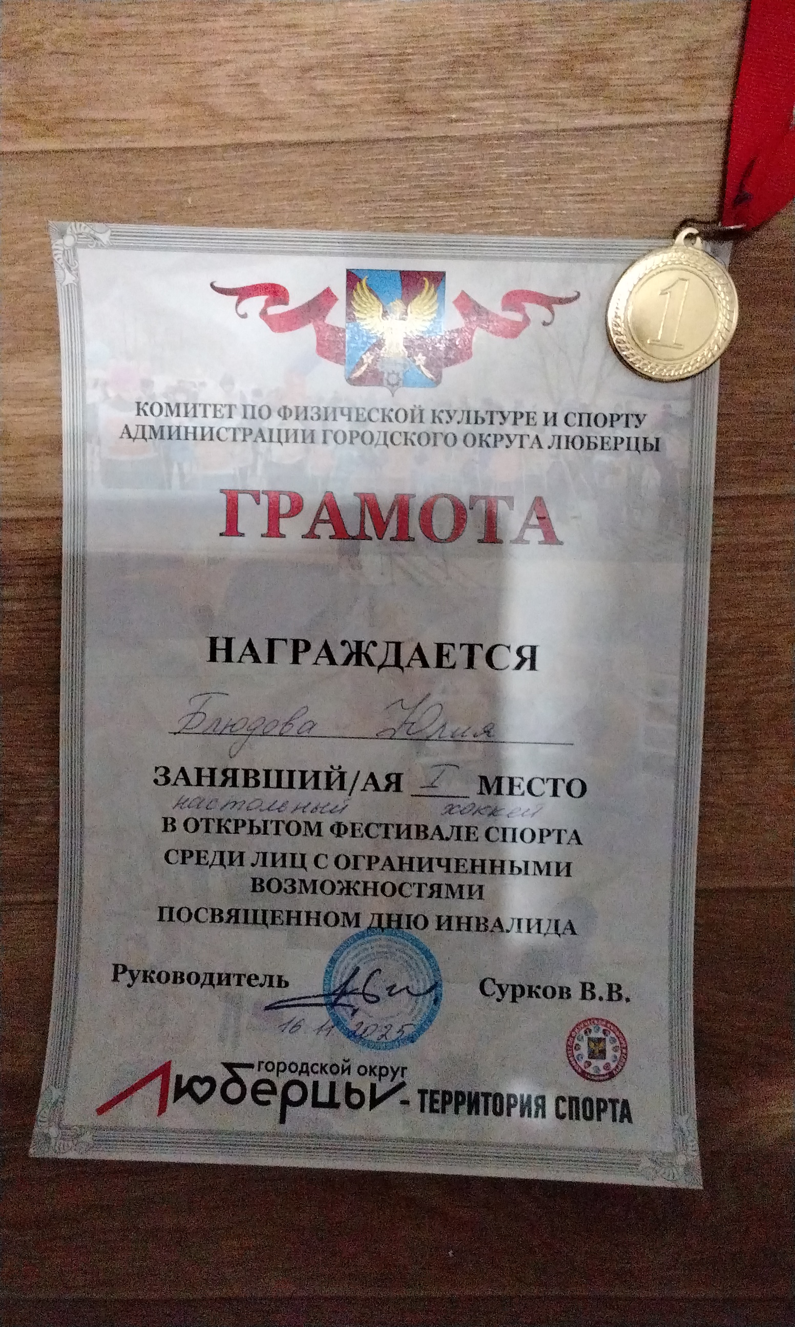 Грамота за 1 в турнире Городского округа Люберцы по настольному теннису среди лиц с ограниченными возможностями здоровья. г.О.Люберцы, 12.03.2023