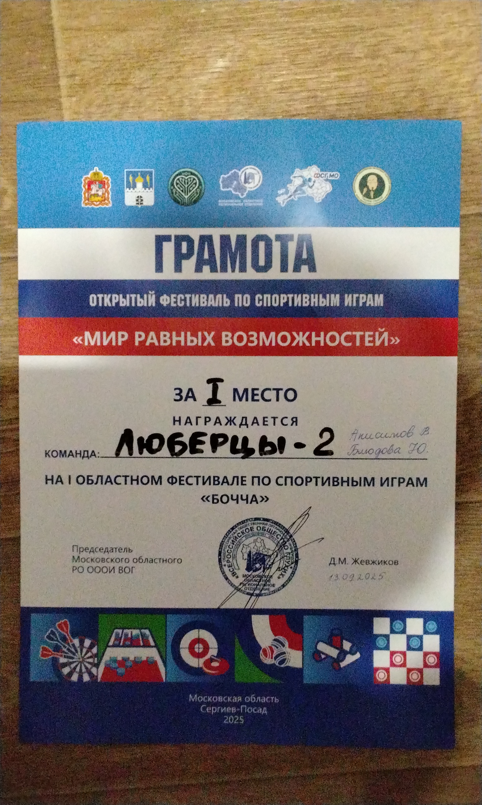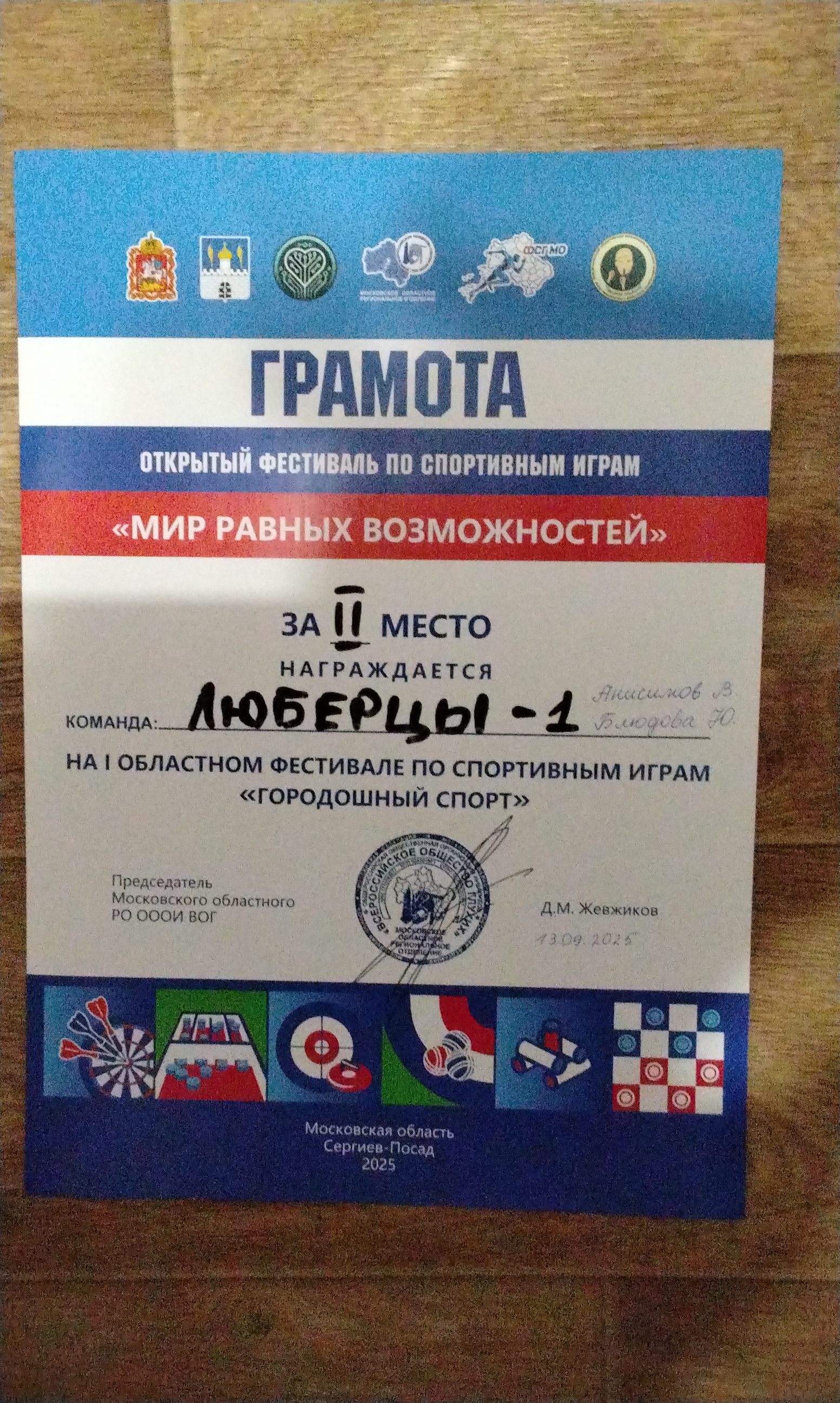 Спартакиада г.о. Люберцы для людей с ОВЗ, посвященная Дню инвалида. Грамота за 2 место. 5 декабря 2021г.