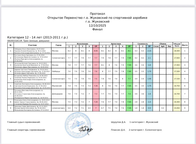 Грамота за участие ( IV место ) в финале Открытого первенства г.о. Жуковский по спортивной аэробика. Номинация - "Трио", возраст - 12 - 14 лет. Дата проведения: 12.10.2025