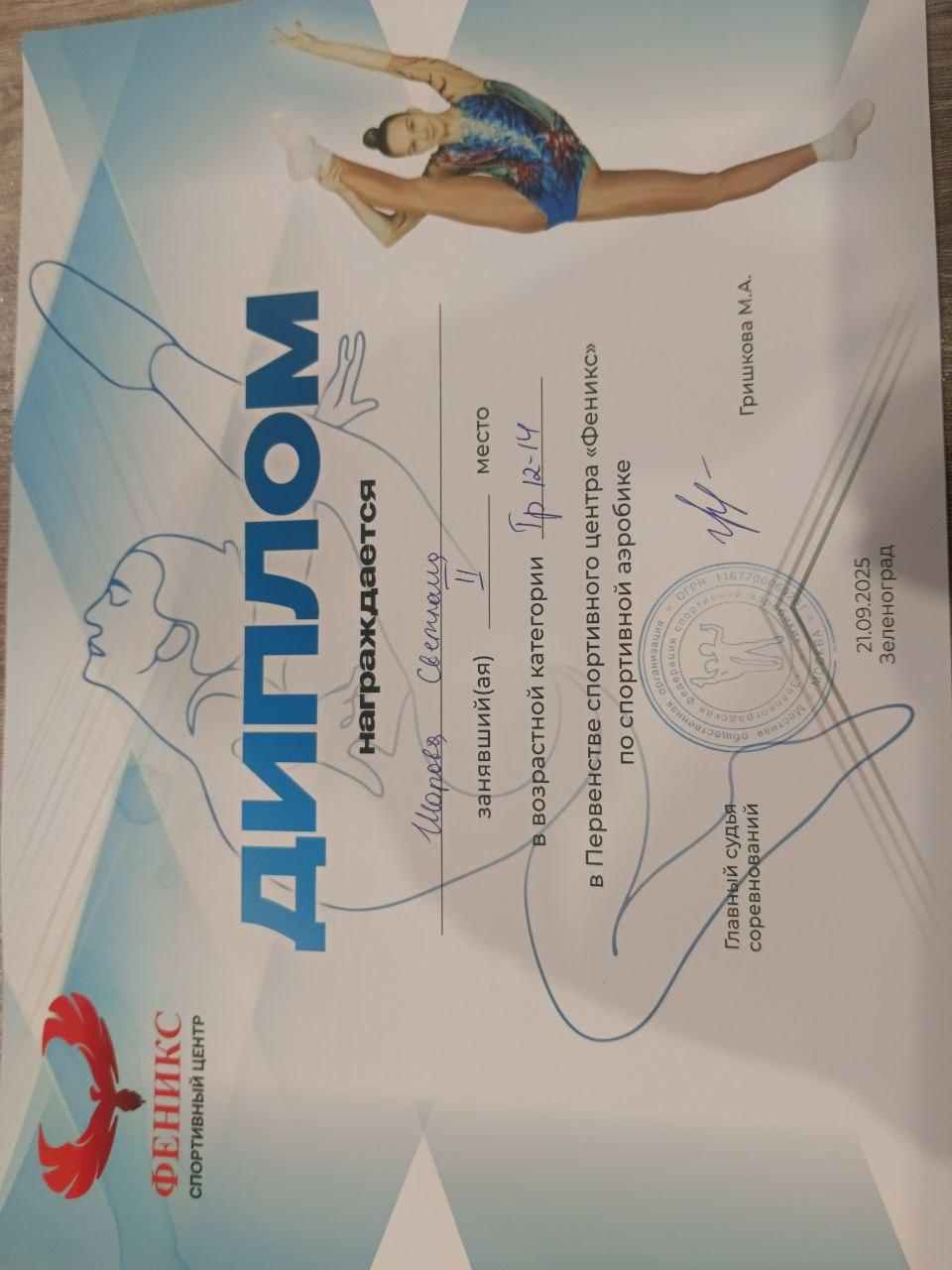 Грамота за II-е место в Первенстве спортивного центра "Феникс" по спортивной аэробике. Возрастная категория - 12-14, номинация - "Группа". Дата проведения - 21.09.2025, г. Зеленоград