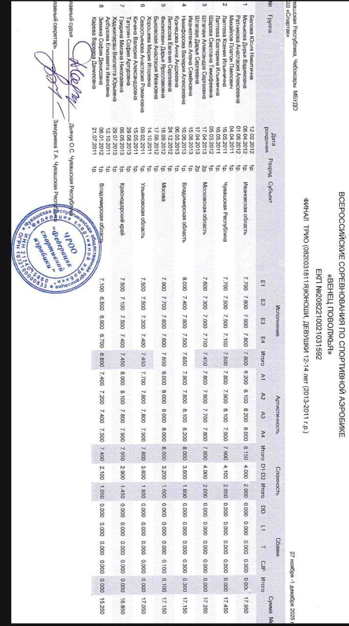 Грамота за участие во Всероссийских соревнованиях по спортивной аэробике "Венец Поволжья" г. Чебоксары, Чувашская республика. Номинация - "индивидуальные выступления", возраст - 12 - 14 лет. Дата проведения: 27.11.2025 - 01.12.2025