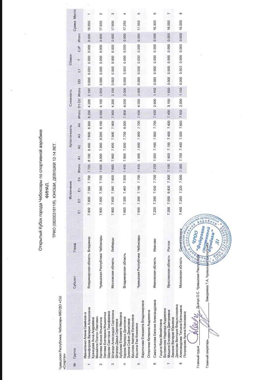 Грамота за VII -е место (участие) в финале Открытого Кубка города Чебоксары (Чувашская республика) по спортивной аэробике. Номинация - "индивидуальные выступления", возраст 12 - 14 лет. Дата проведения: 27.11.2025