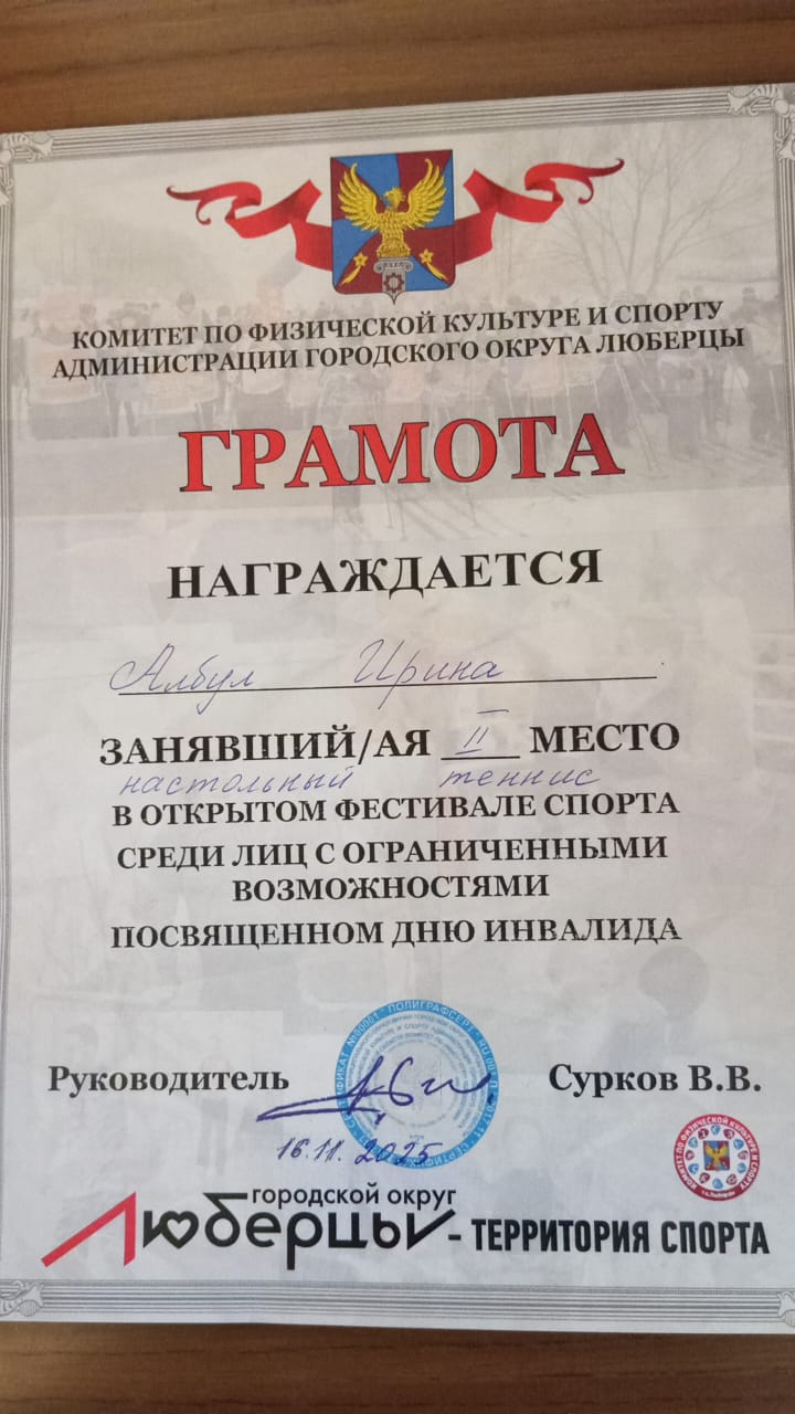 Грамота 2 место по настольному теннису в Открытом фестивале спорта, посвященному международному дню инвалидов, г.о.Люберцы, 8.12.2024