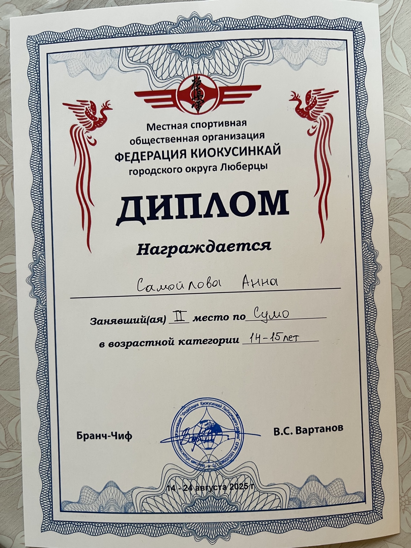 Диплом за 2 место по сумо в возрастной категории 14-15 лет. 14-24 августа 2025г. Люберцы.