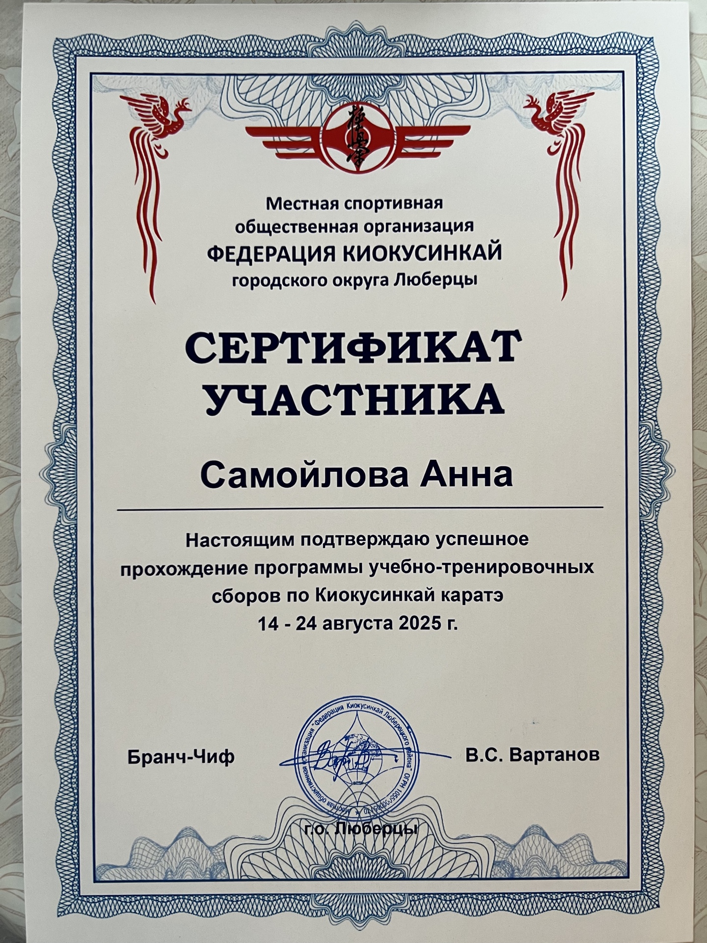 Сертификат участника учебно-тренировочных сборов по киокусинкай каратэ 14-24 августа 2025 г. Люберцы.