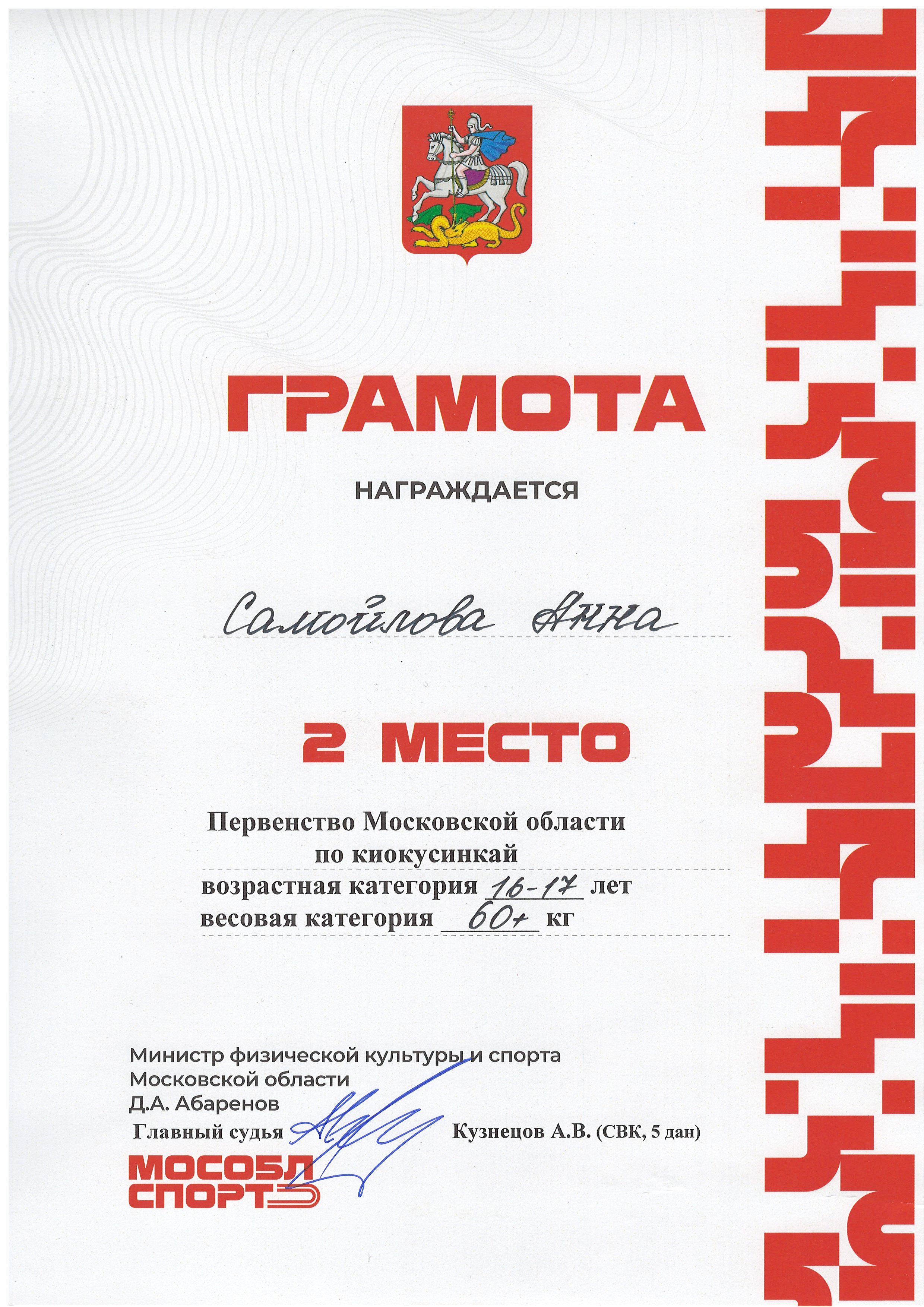 Грамота за 2 место в открытом Чемпионате и Первенстве г.о. Люберцы по Киокусинкай среди мальчиков и девочек, юношей и девушек, юниоров и юниорок, мужчин и женщин в категории 12-13 лет, 55+ кг. Люберцы, 12.03.2023г.