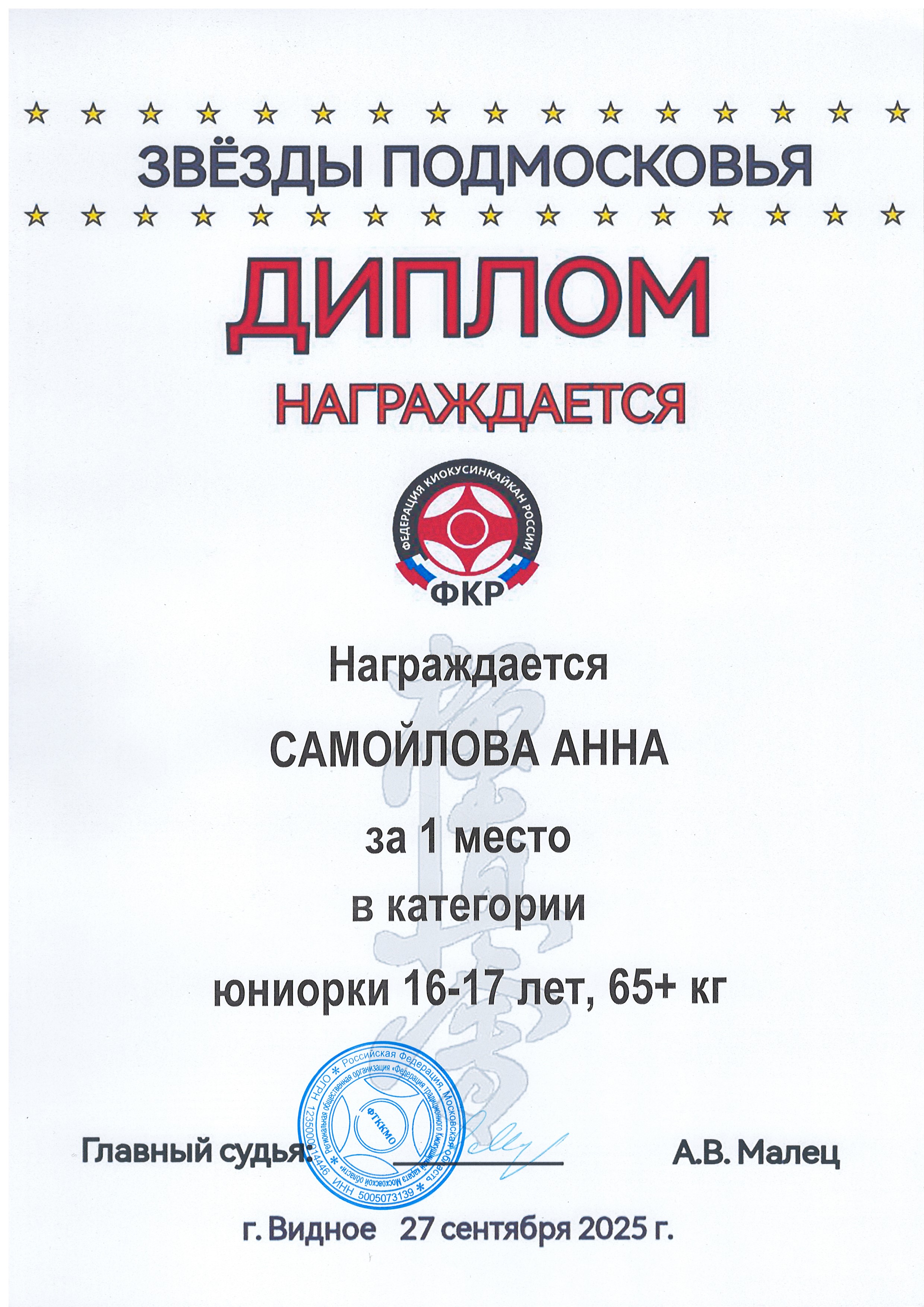Диплом за 1 место в региональном турнире "Звезды Подмосковья" в категории юниорки 16-17 лет, 65+ кг. 27.09.2025г. Видное.