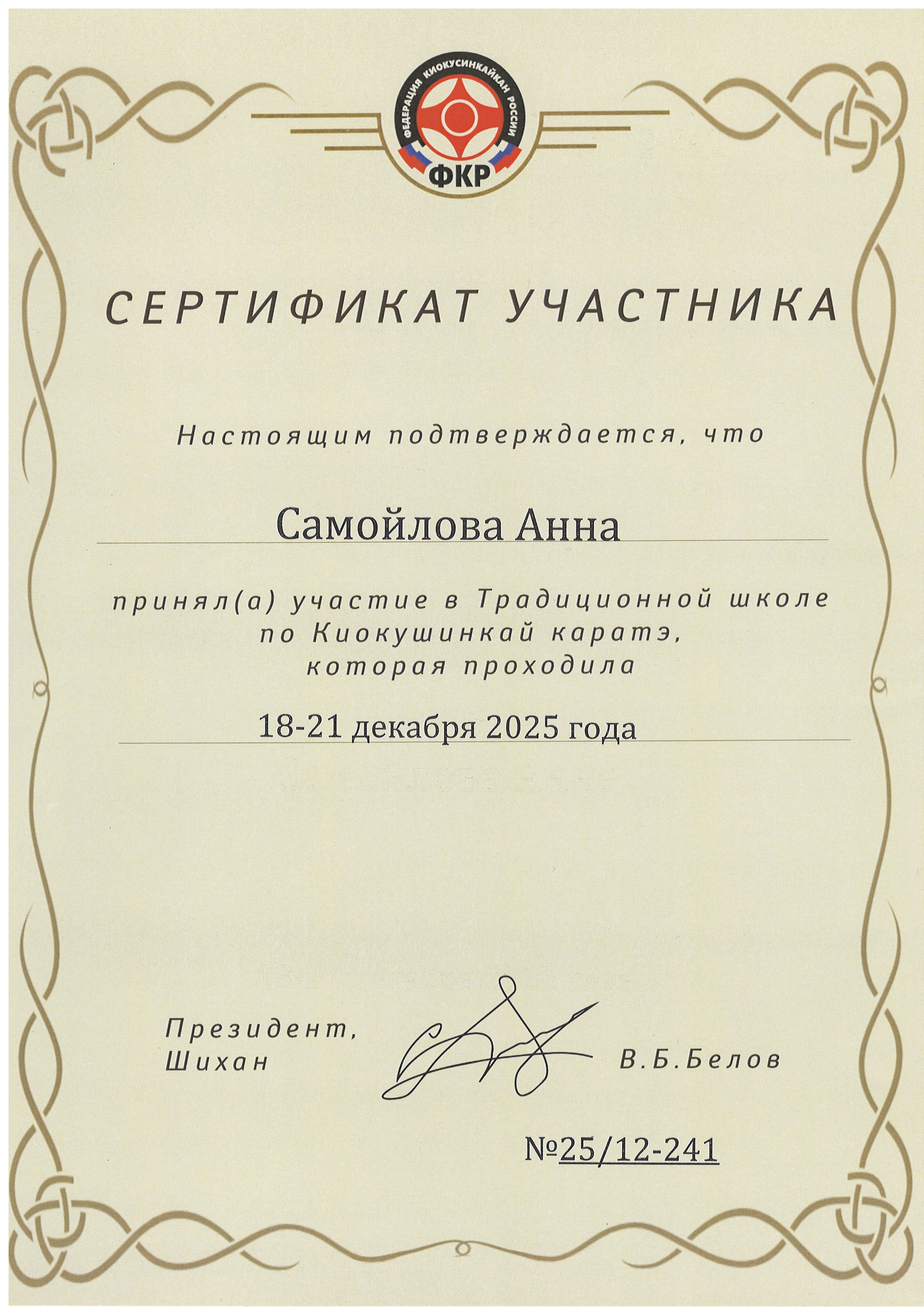 Сертификат №25\12-241 участника Всероссийской традиционной школы по киокушинкай каратэ 18-21 декабря 2025 г. (Печать не ставится). Чехов.