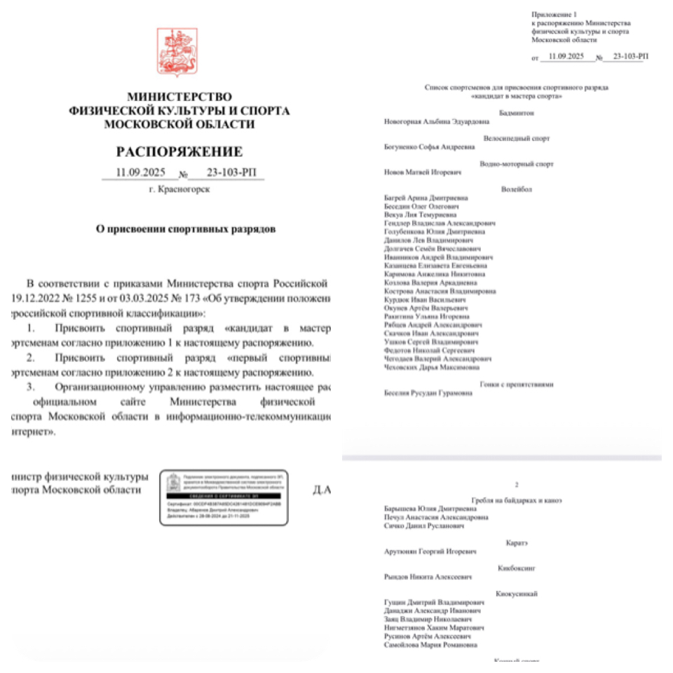 Распоряжение Министерства физической культуры и спорта Московской области от 11.09.2025г. №23-103-РП о присвоении спортивного разряда "кандидат в мастера спорта" по киокусинкай.