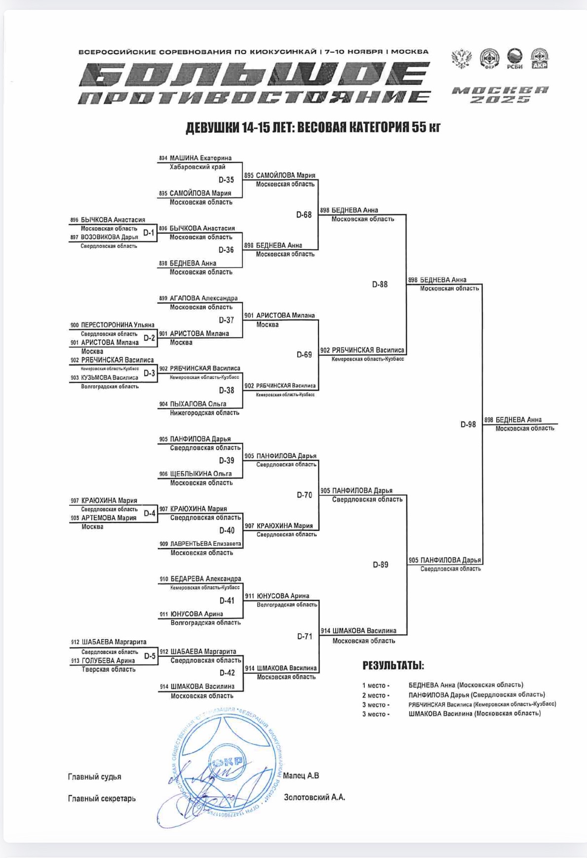 Протокол участия во Всероссийских соревнованиях по киокусинкай "Большое Противостояние" 7-10 ноября 2025г. в категории девушки 14-15 лет до 55 кг. Москва.