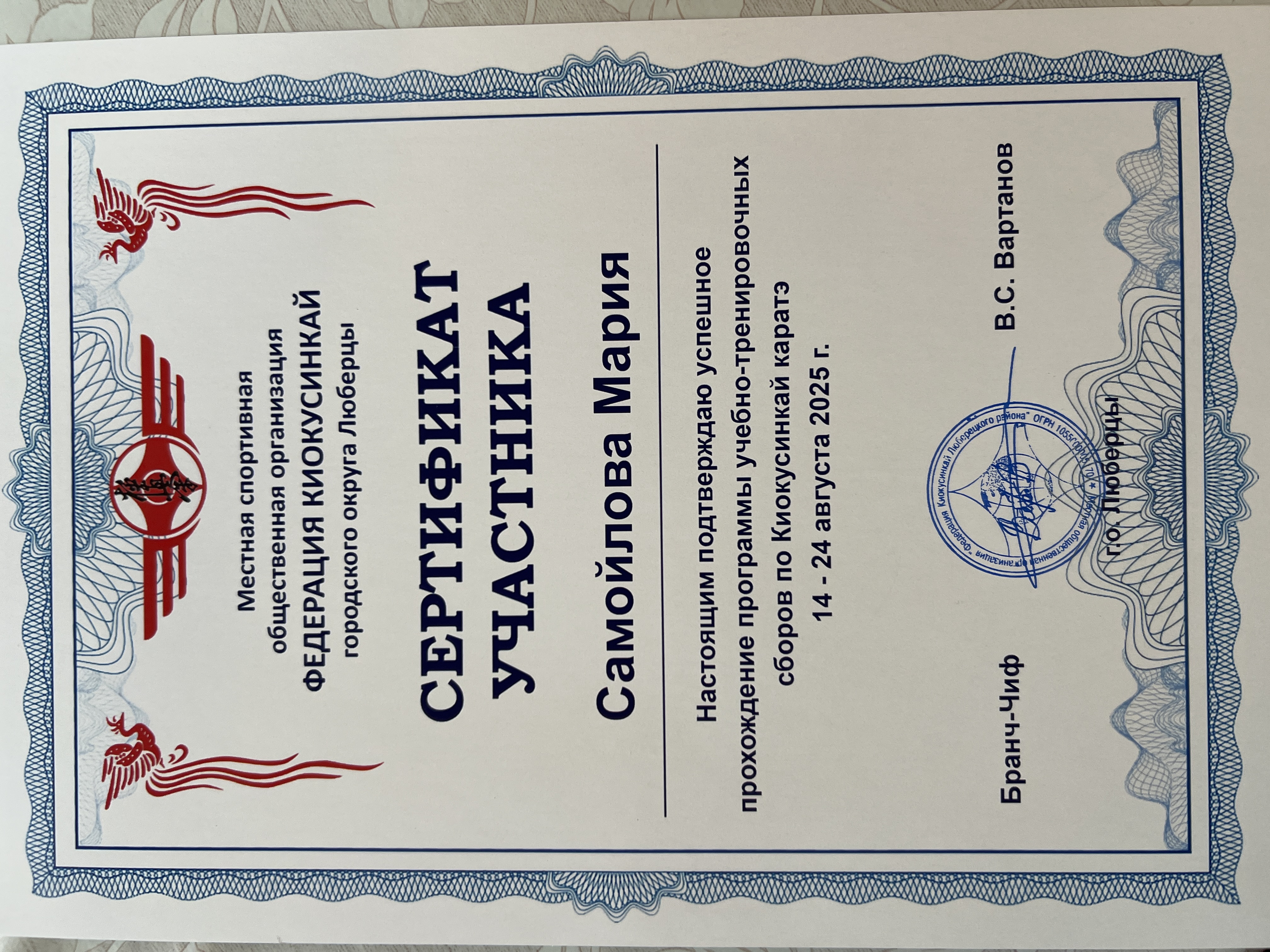 Сертификат участника учебно-тренировочных сборов по киокусинкай каратэ 14-24 августа 2025г. Люберцы.