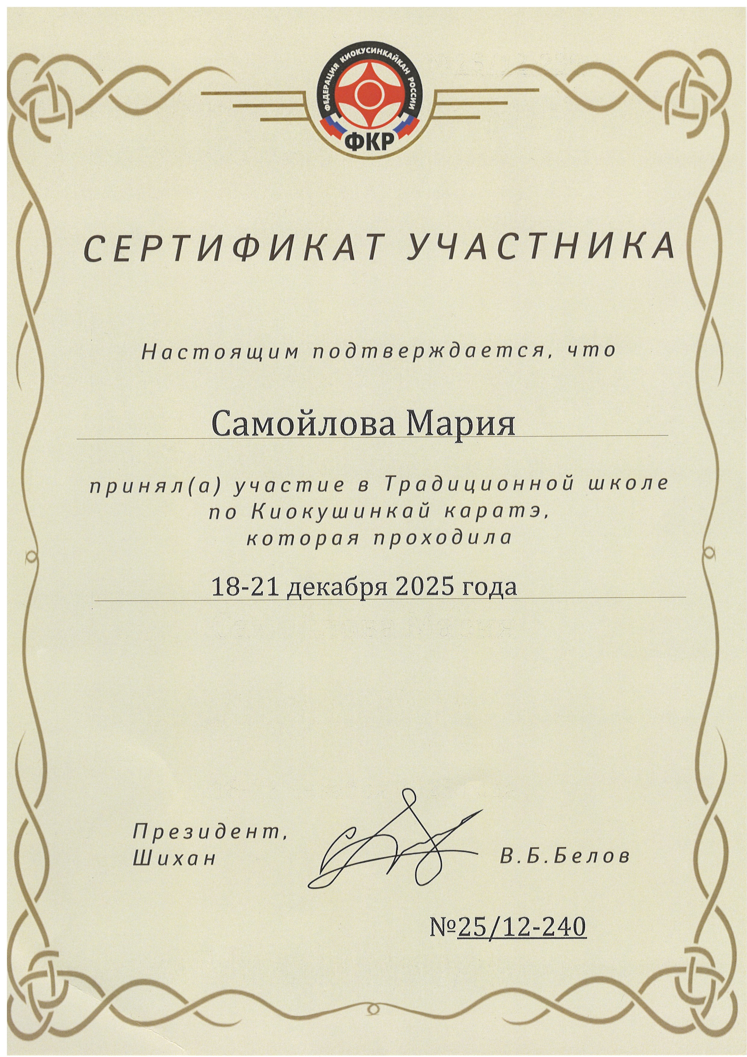 Сертификат участника №25\12-240 во Всероссийской традиционной школе по киокушинкай каратэ 18-21 декабря 2025г. Чехов. (Печать не ставится).