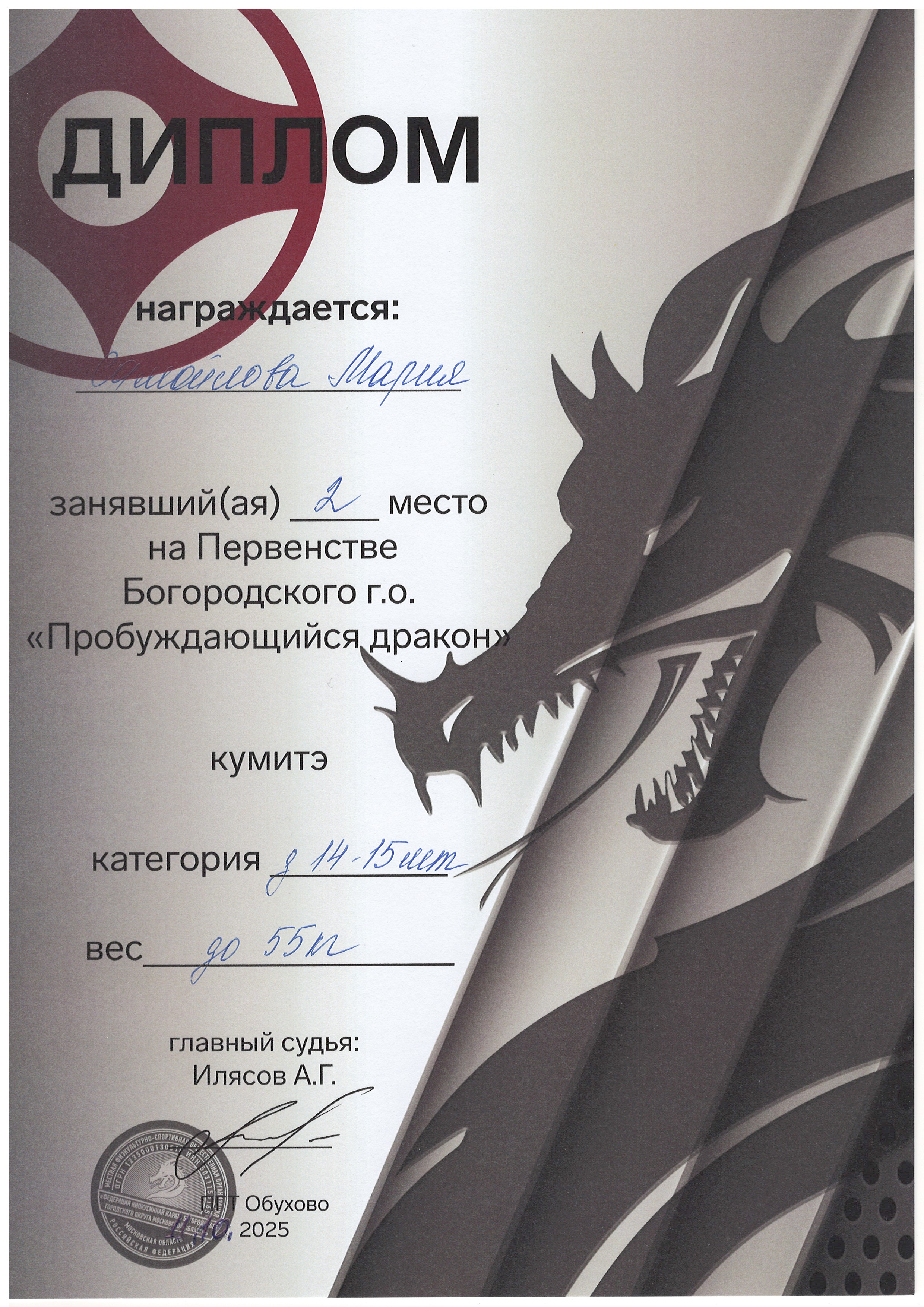 Диплом за 2 место на Первенстве Богородского г.о. "Пробуждающийся дракон" в категории кумитэ девушки 14-15 лет, до 55 кг. 11.10.2025. Обухово.
