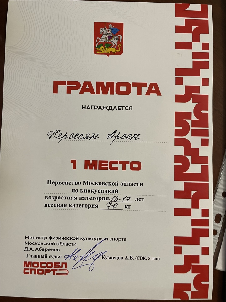 | 1 место в Первенстве Московской области по киокусинкай ( 16-17 лет, весовая категория 70 кг) 20 сентября 2025 год, Московская область | Начислено 7 очков рейтинга | ||