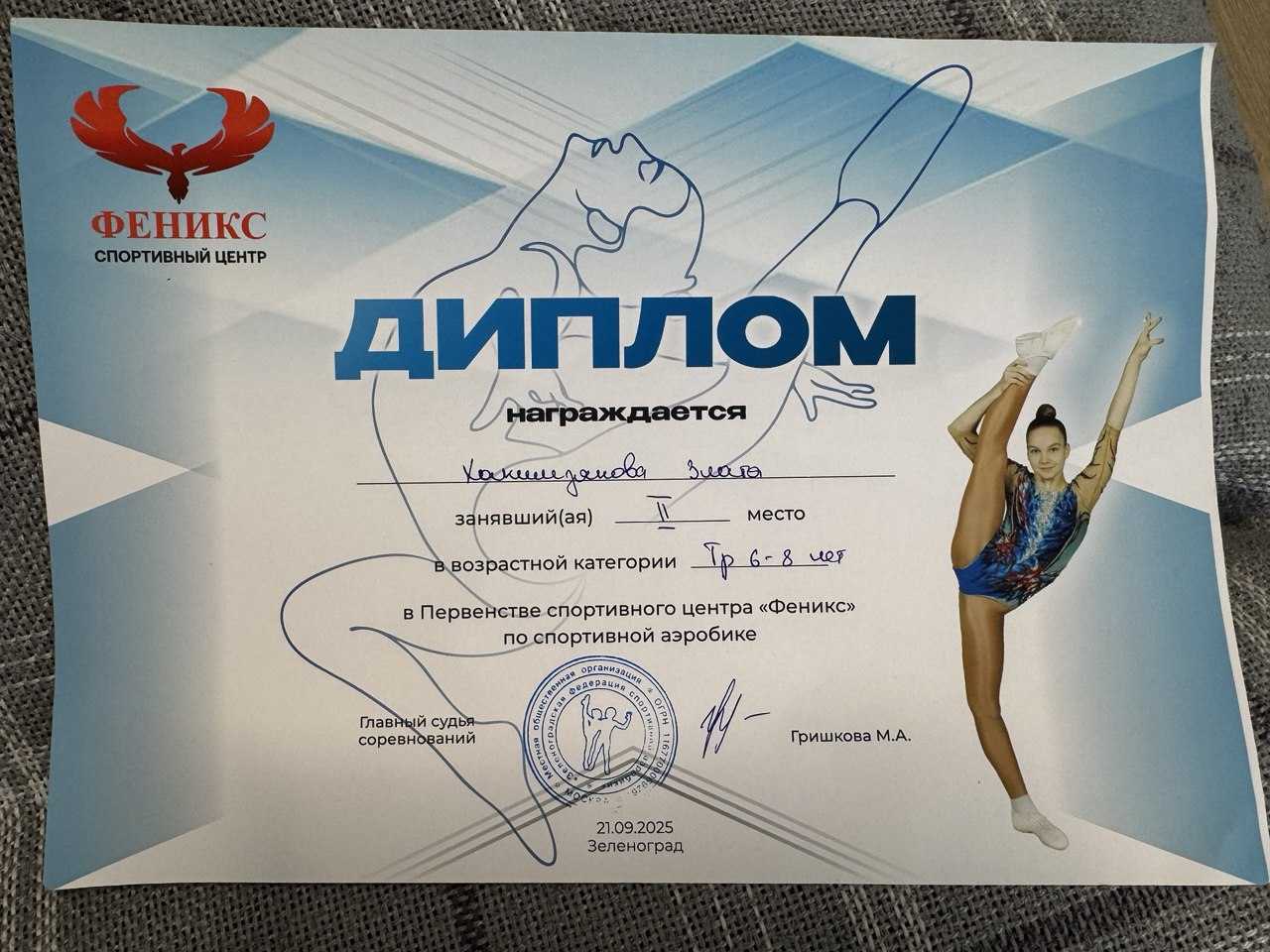 Диплом за 2 место в возрастной категории Тр 6-8 лет в Первенстве спортивного центра "Феникс" по спортивной аэробике. 21.09.2025 Зеленоград.