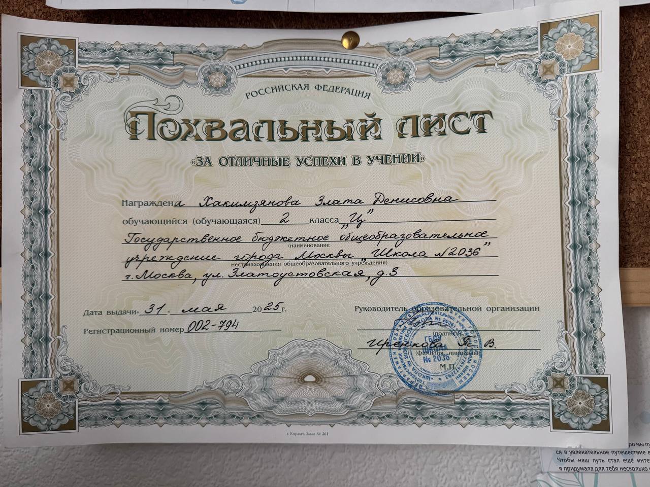 Похвальный лист за отличные успехи в учении награждена Хакимзянова Злата Денисовна, обучающийся 2 класса Ц. 31 мая 2025, г.Москва