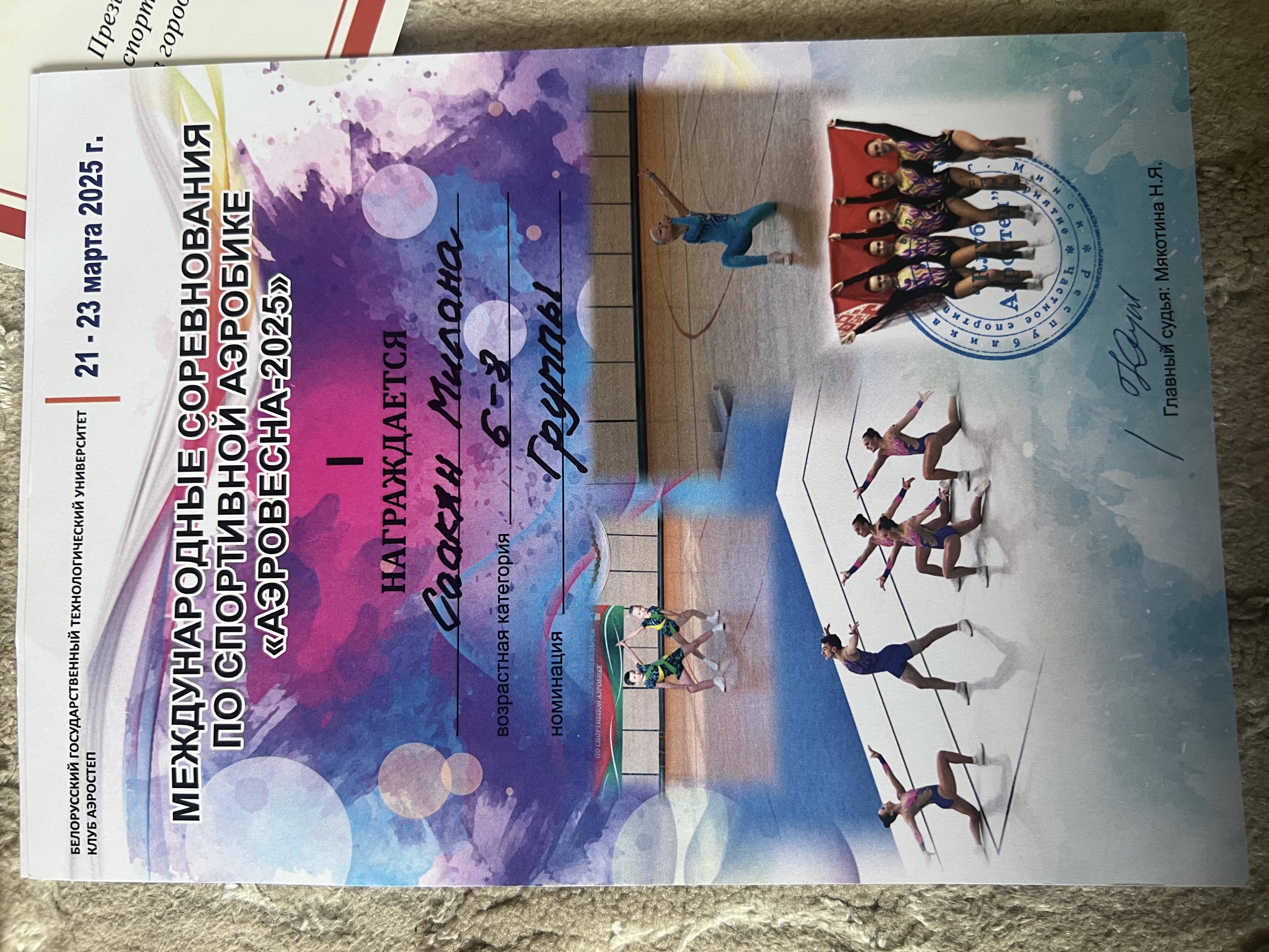 Грамота за 1 место в групповом упражнении категории 6-8 лет .в турнире «Рыцари аэробики» г. Суздаль 2-3 марта 2025 год