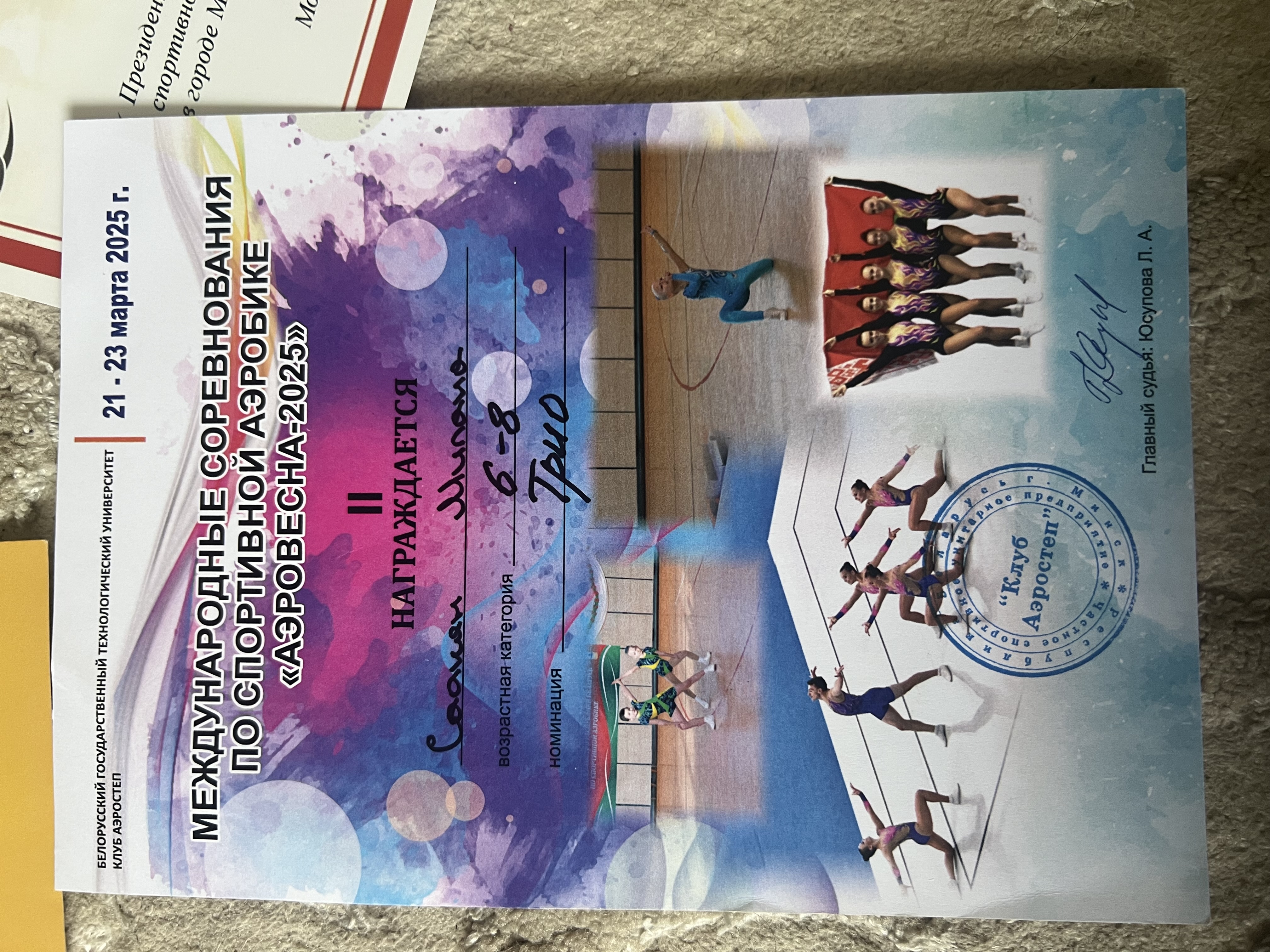 Грамота 2 место в Открытом первенстве МБУ ДО "Спортивная школа №1" г.о.Солнечногорск по спортивной аэробике "Весенние ласточки" среди трио , 14 апреля 2024 года