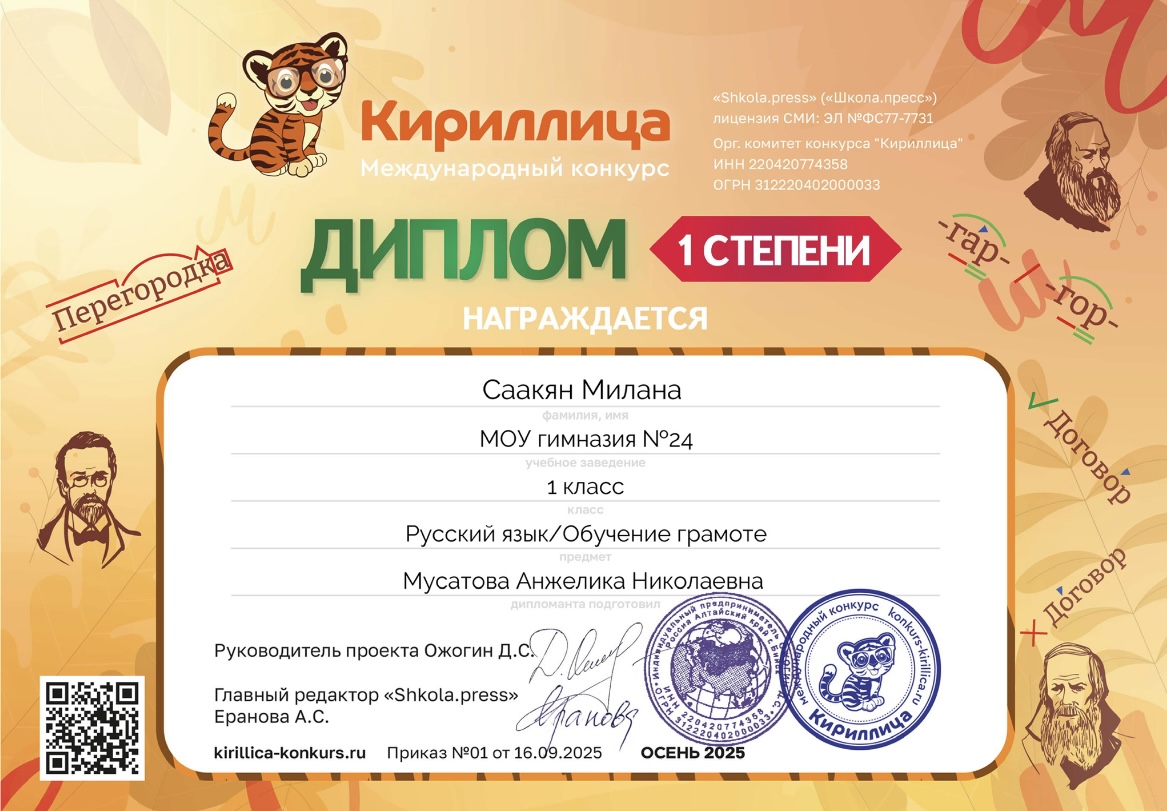 Диплом 1 степени за олимпиаду по русскому языку / обучение грамоте в международном конкурсе Кириллица . 1 класс , осень 2025 года