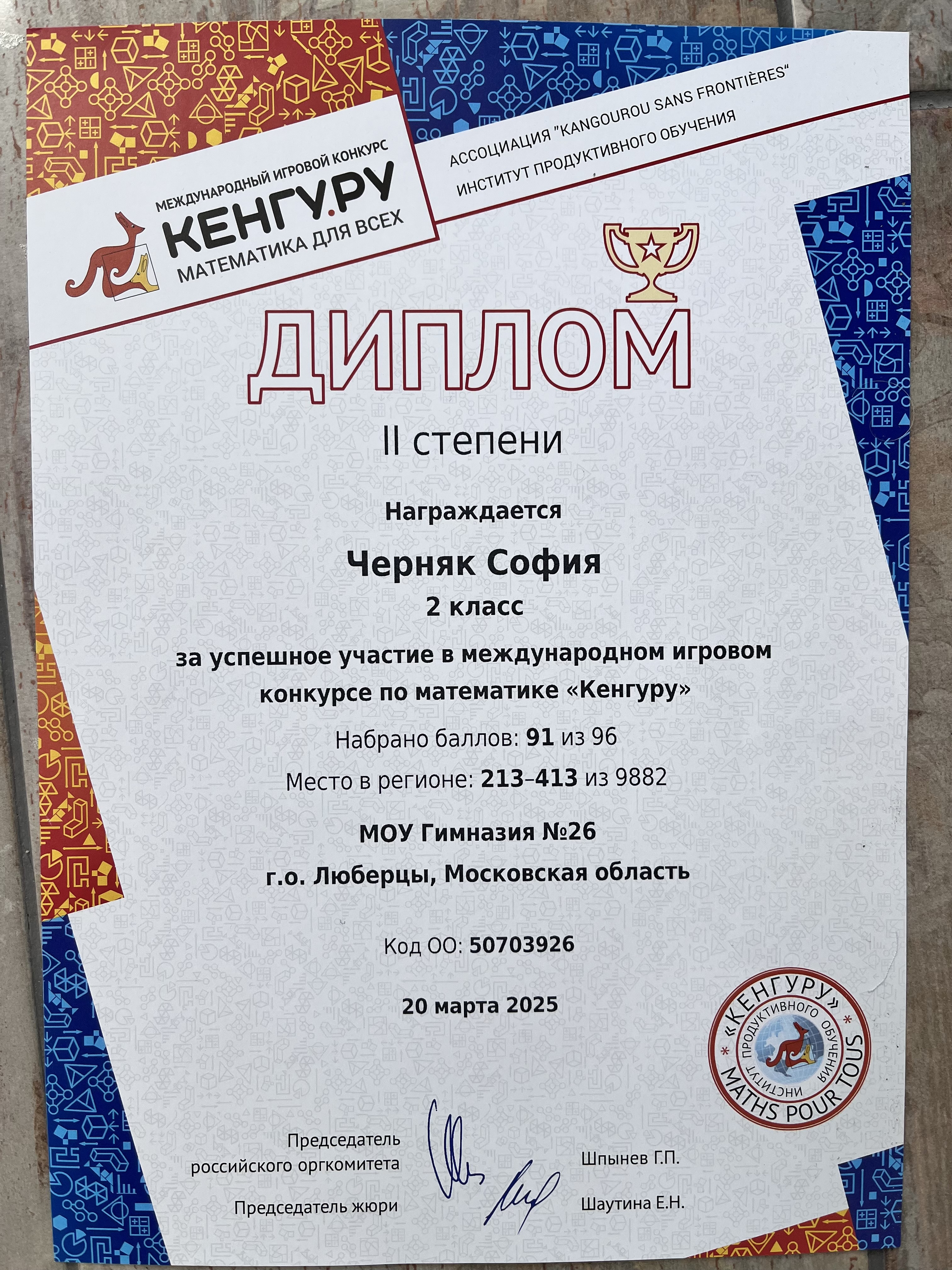 Диплом II степени за успешное участие в международном игровом конкурсе по математике «Кенгуру» набрано баллов 91 из 96. Место в регионе 213-413 из 9882. Код ОО:50703926. МОУ Гимназия #26 г.о. Люберцы Московская область. 20 марта 2025 год