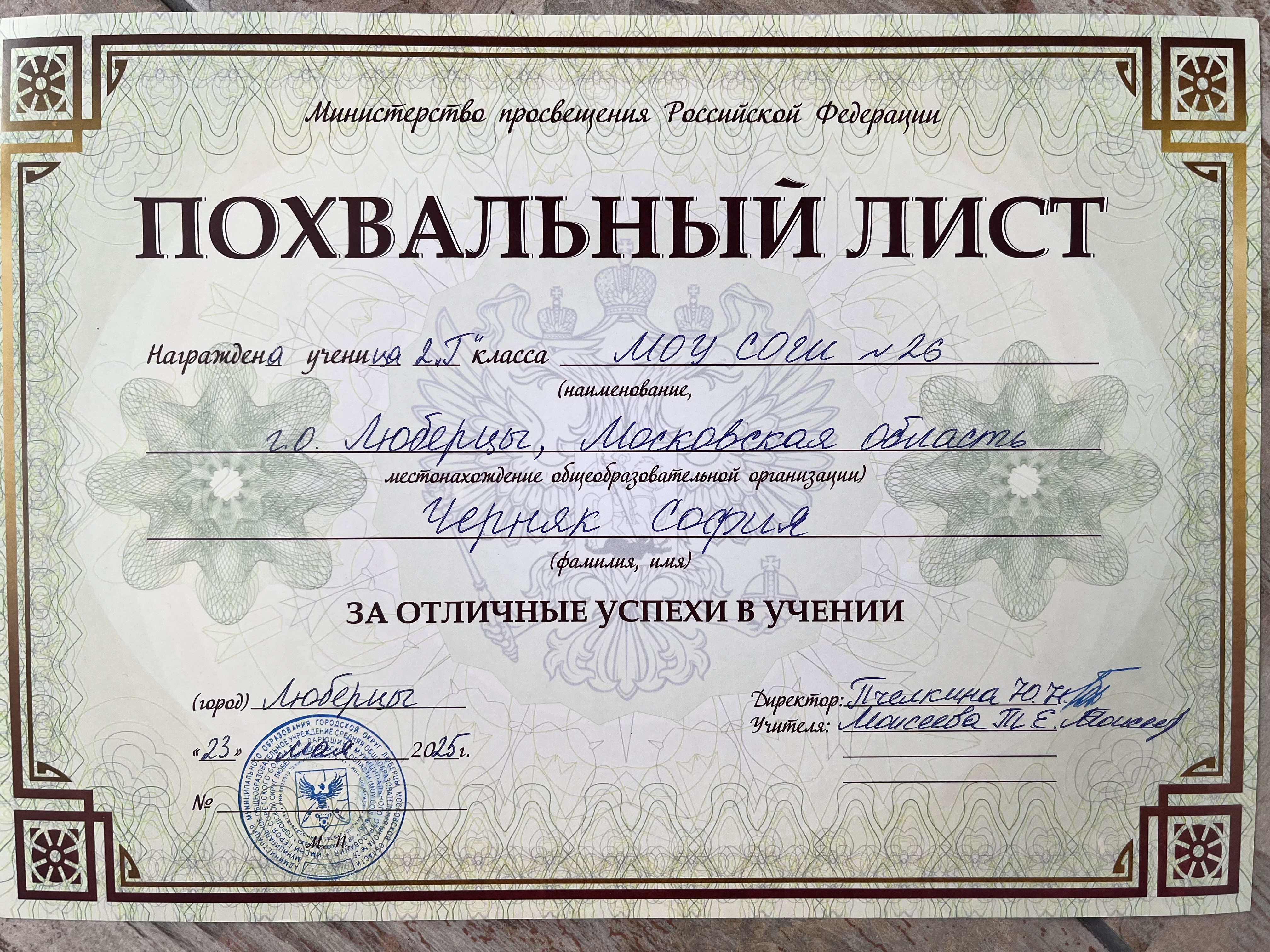 Похвальный лист. Награждена ученица 2 класса МОУ СОШ #26 г.о. Люберцы, Московская область. За отличные успехи в учении. Люберцы. 23 мая 2025 год.