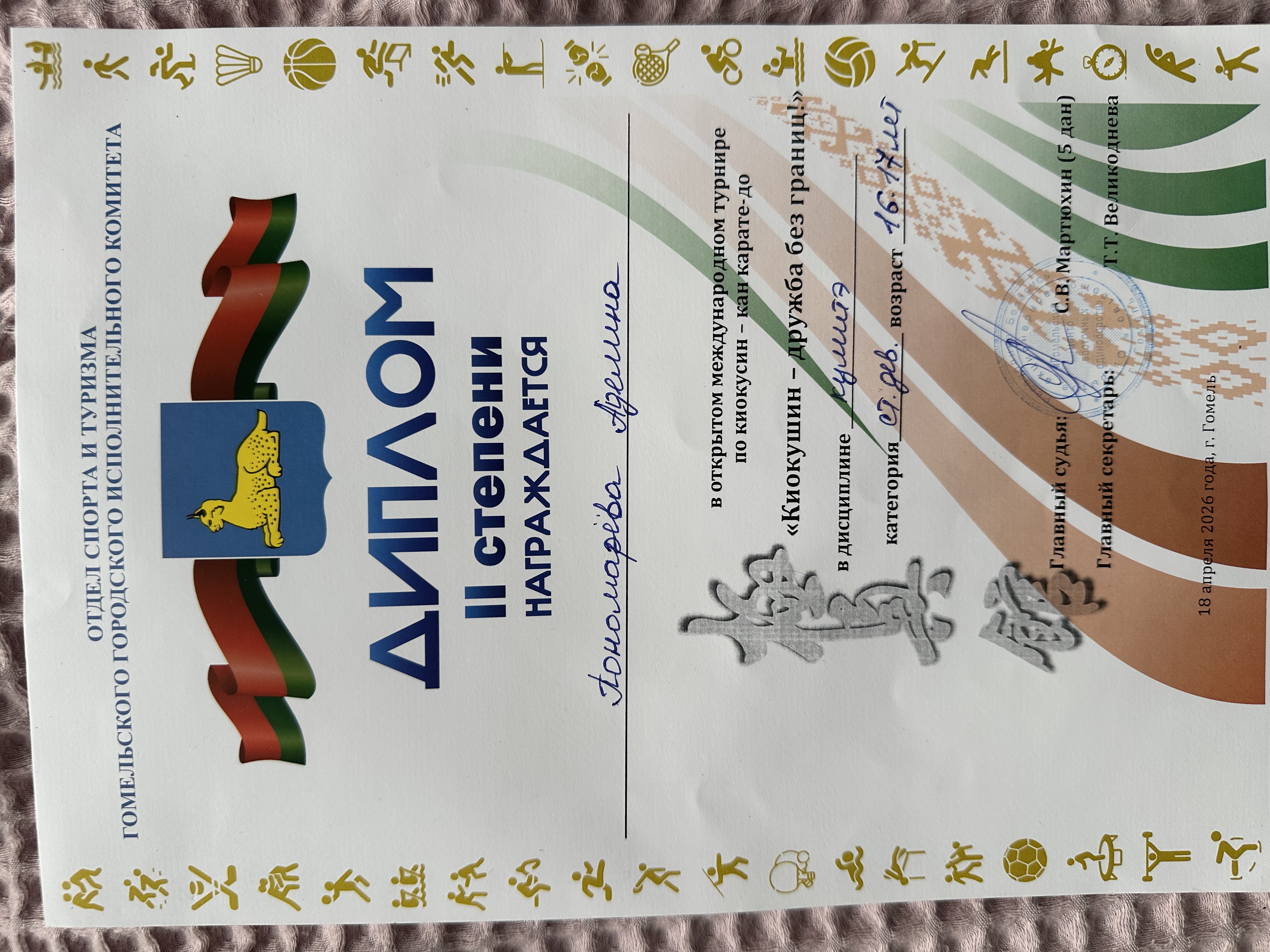 Диплом за 2 место в международном турнире «Киокушин-дружба без границ» по киокушин -кан каратэ-до, в категории юниорки 16-17 лет, 60+(ст.дев) 18 апреля 2026г. Республика Беларусь г.Гомель
