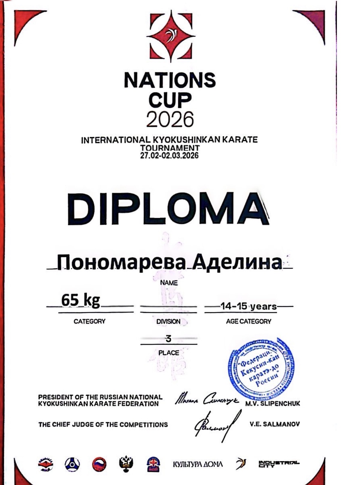 диплом за 3 место в турнире "Nations Cup 2026" по киокусинкай в категории девушки 14-15 лет 65 кг, 27.02-02.03.2026г, город Москва.