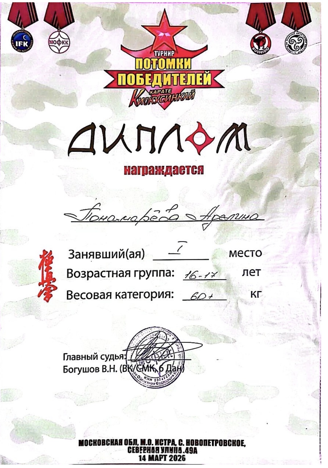 Диплом за 1 место в турнире "Потомки Победителей" по киокусинкай в категории юниорки 16-17 лет, 60 кг, 14.03.2026г, Московская область м.о. Истра с. Новопетровское
