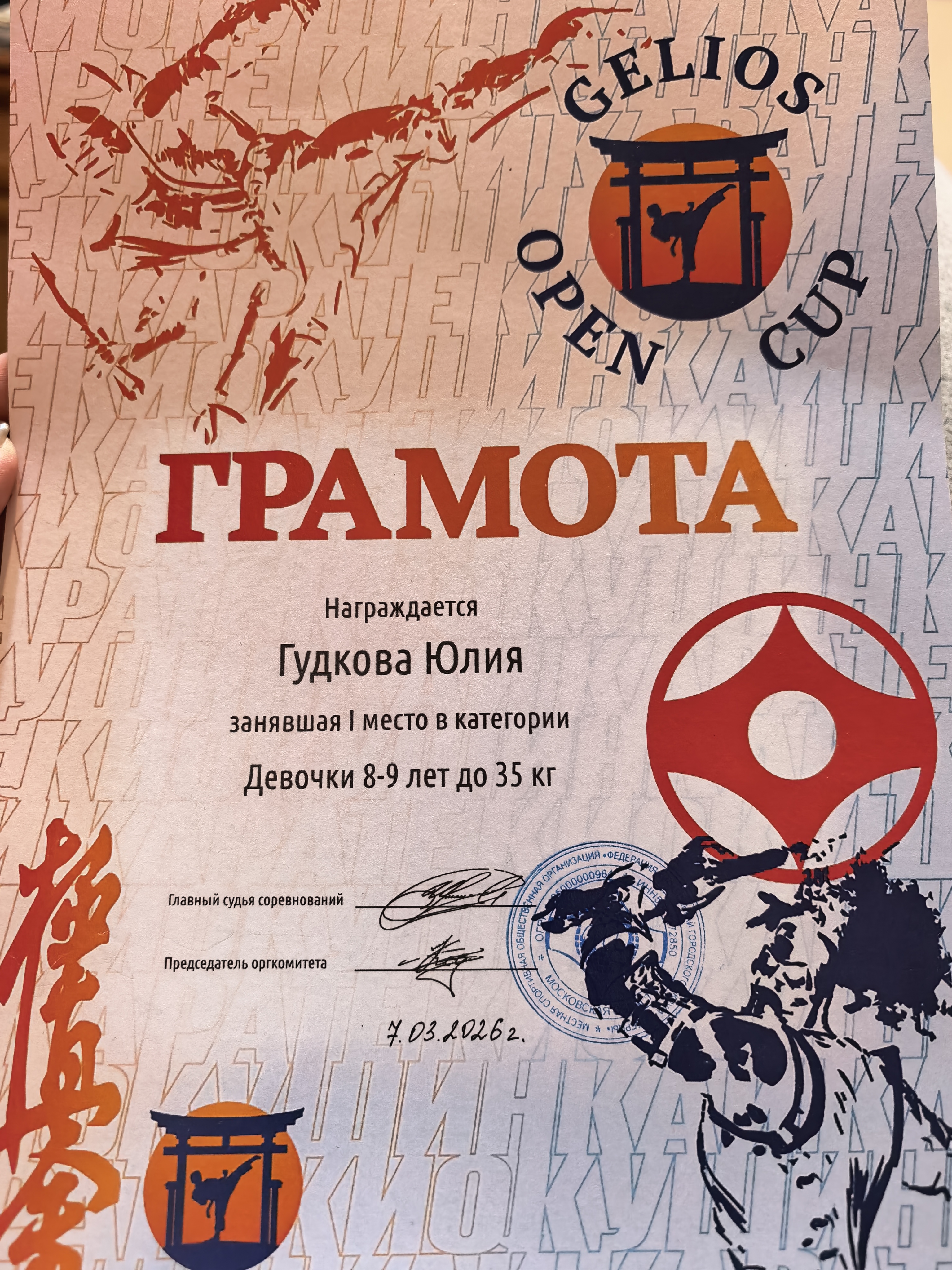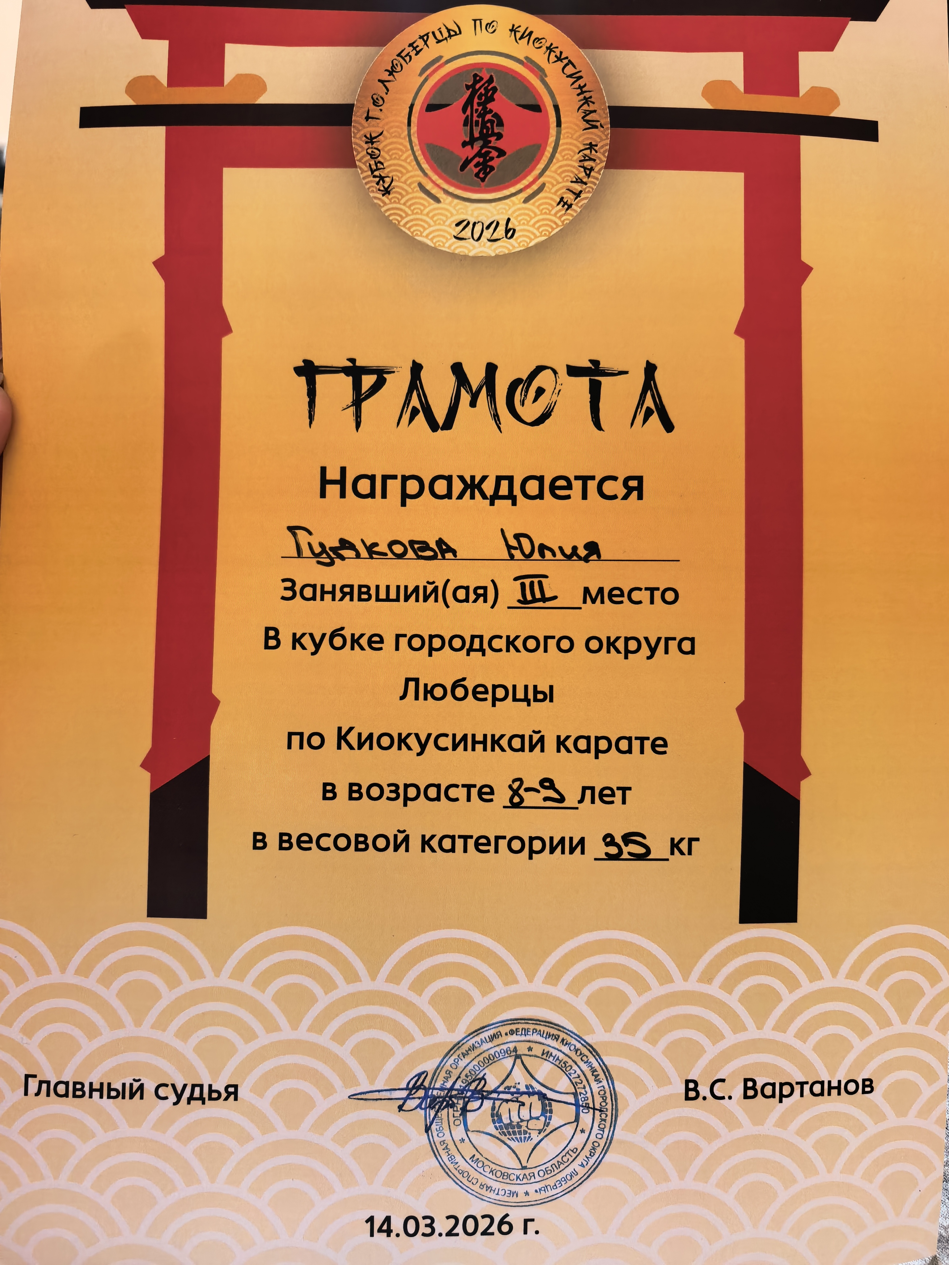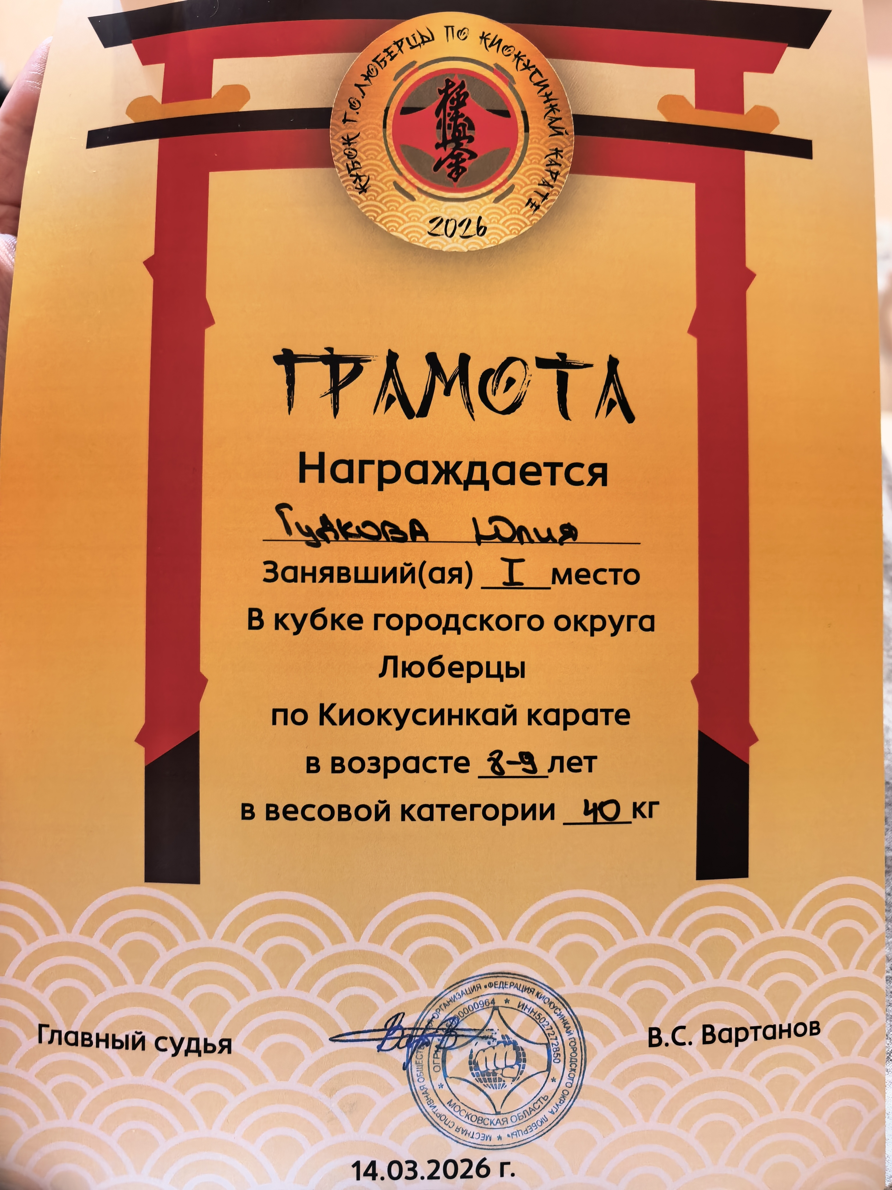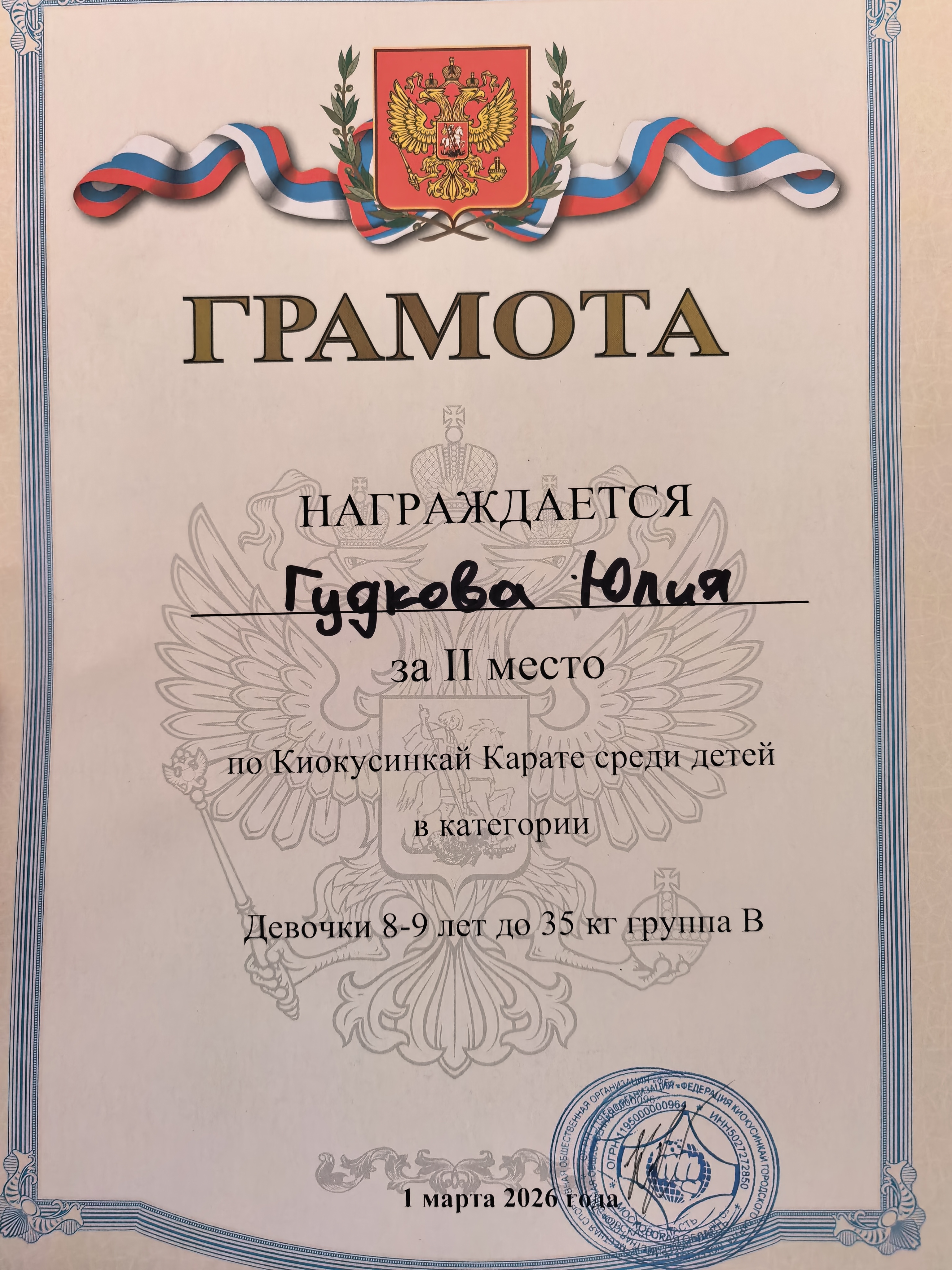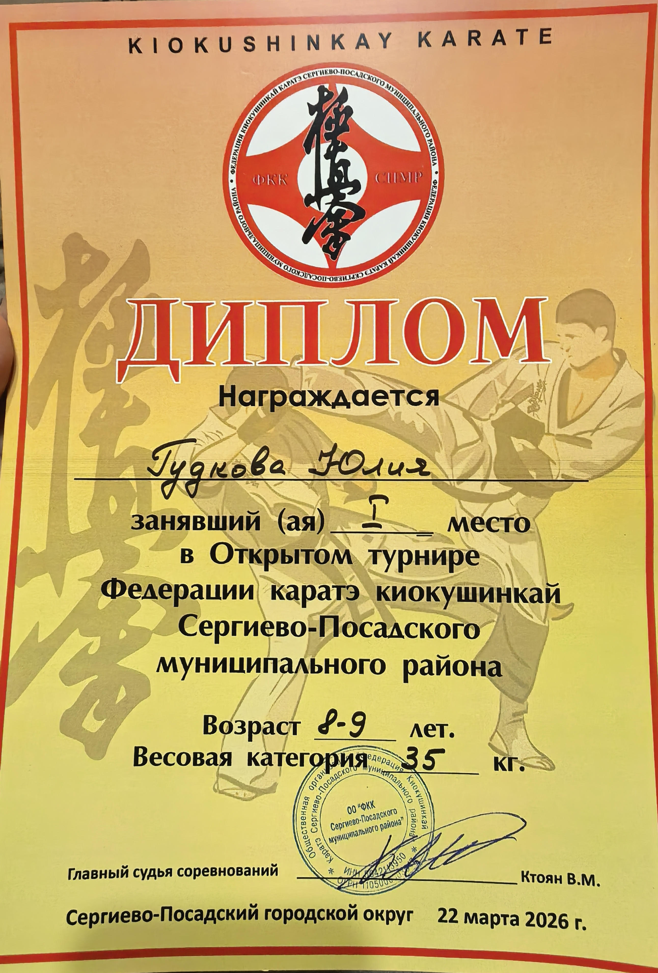 Диплом за 1 место в Открытом турнире Федерации каратэ киокушинкай Сергиево-Посадского муниципального района. Возраст 8-9 лет. Весовая категория 35 кг.22 марта 2026 г.