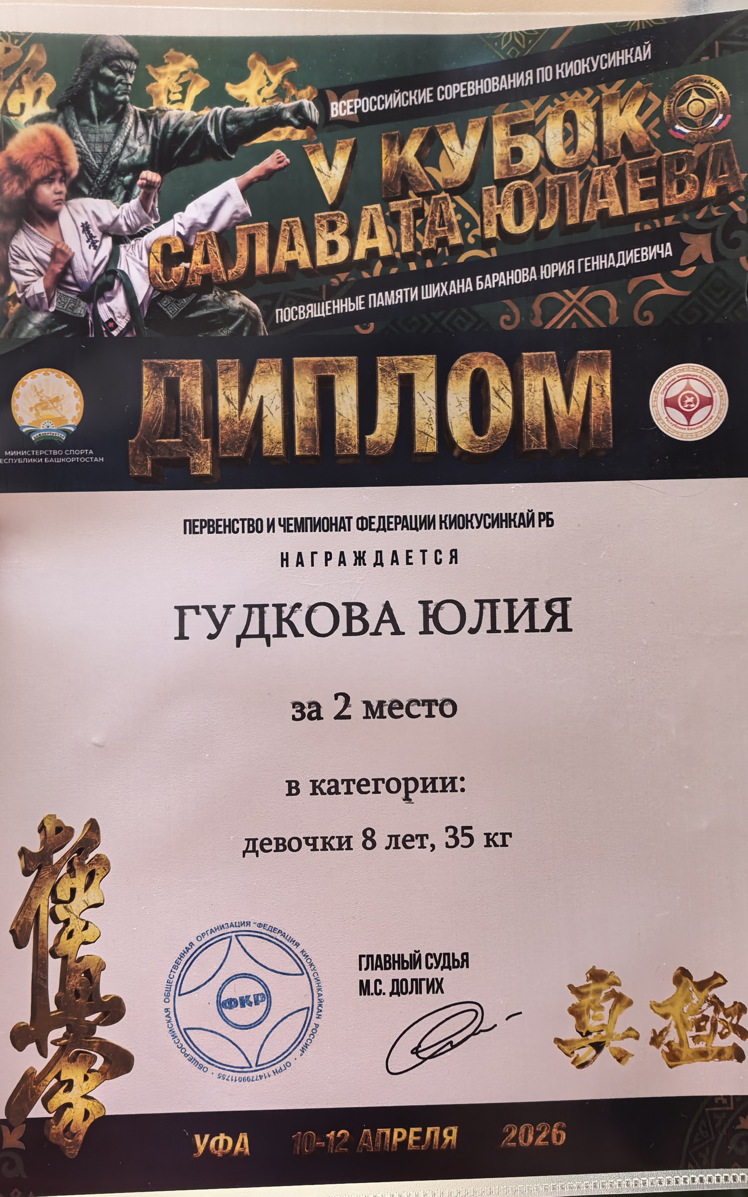 Диплом за 2 место в региональных соревнованиях по киокусинкай "GOLDEN RING CUP". Девочки 8-9 лет: весовая категория 30+ кг.