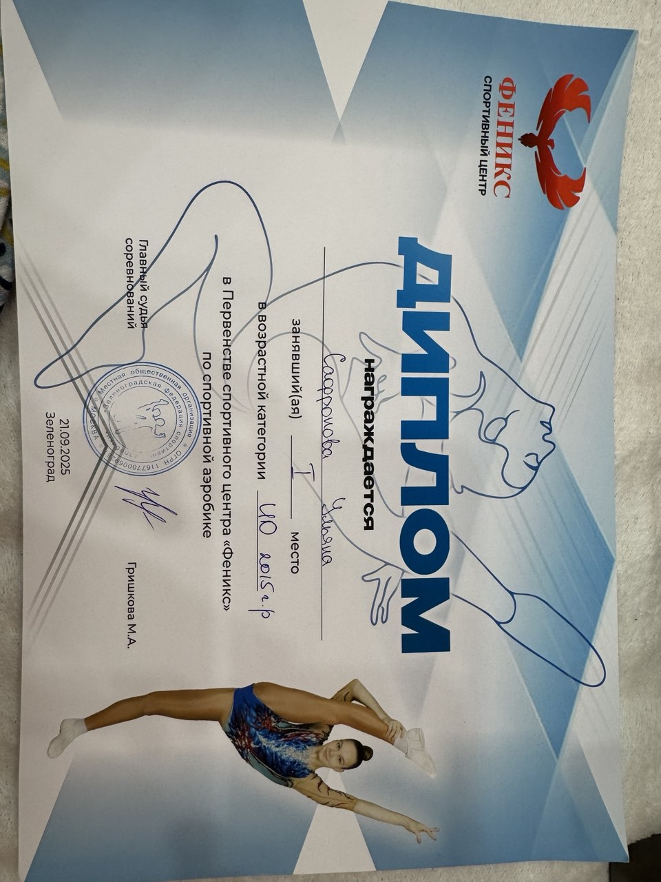 Диплом 2 место "Первенство спортивного центра Феникс по спортивной аэробике", в номинации Индивидуальные выступления девочек 2015г., 22.09.2024 г. Зеленоград,