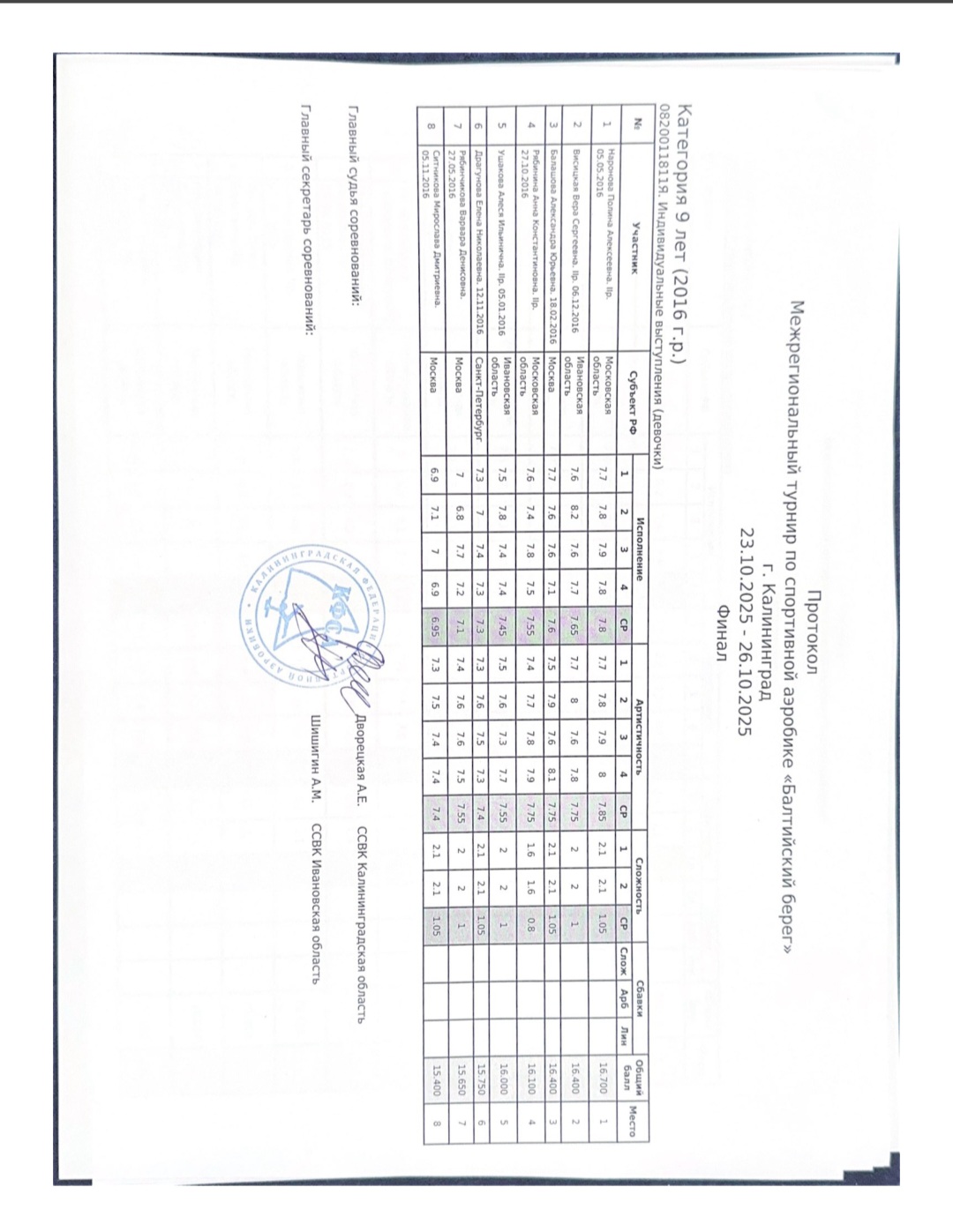 Межрегиональные соревнования по спортивной аэробике "Балтийский берег" г. Калининград. Протокол Индивидуальных выступлений девочек 2016года, финал 4 место., 23.10.2025г