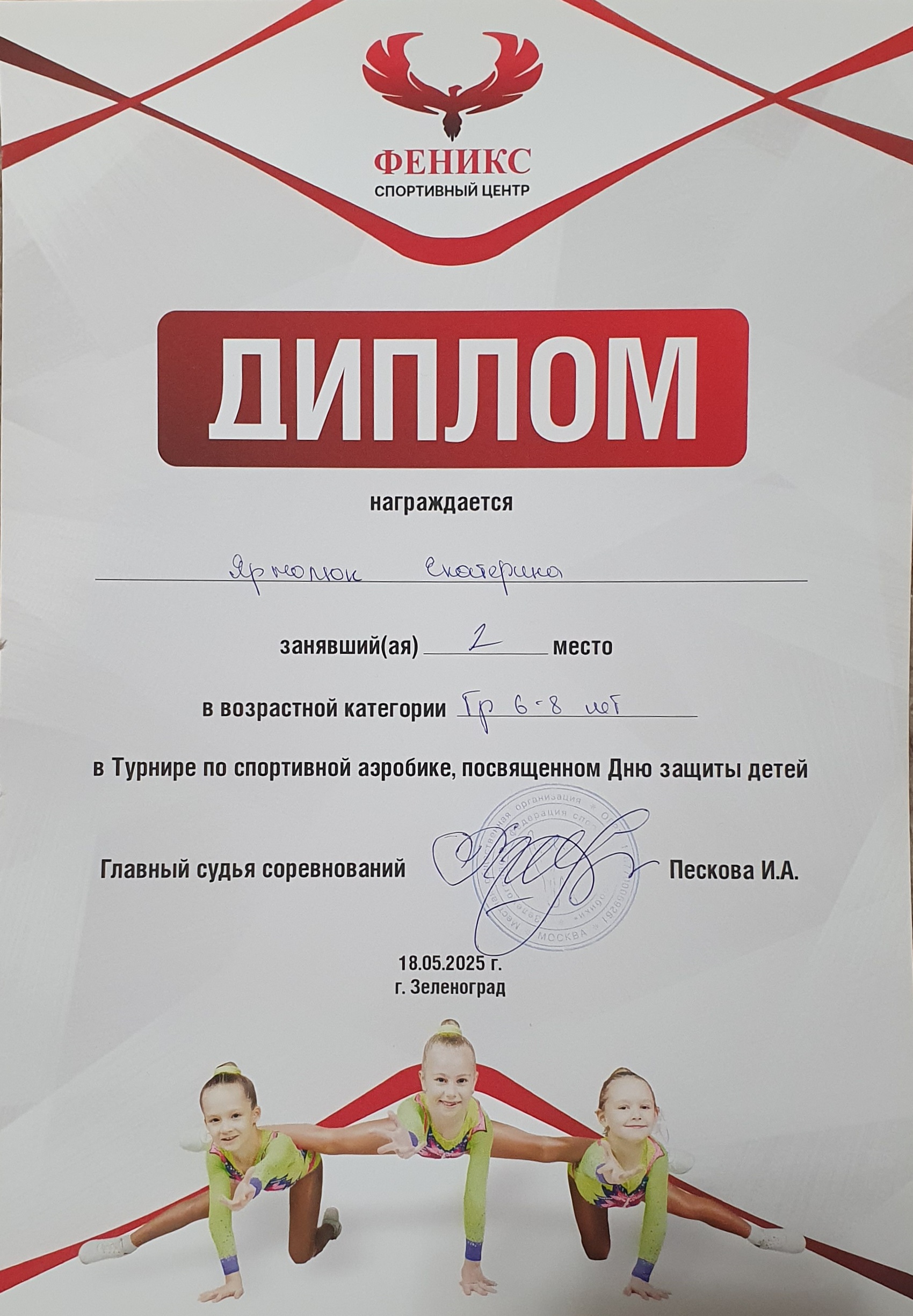 Диплом за 2 место в Турнире по спортивной аэробике, посвященном Дню защиты детей, в возрастной категории ГР 6-8 лет, г. Зеленоград, 18.05.2025 г. Организатор: Зеленоградская федерация спортивной аэробики.