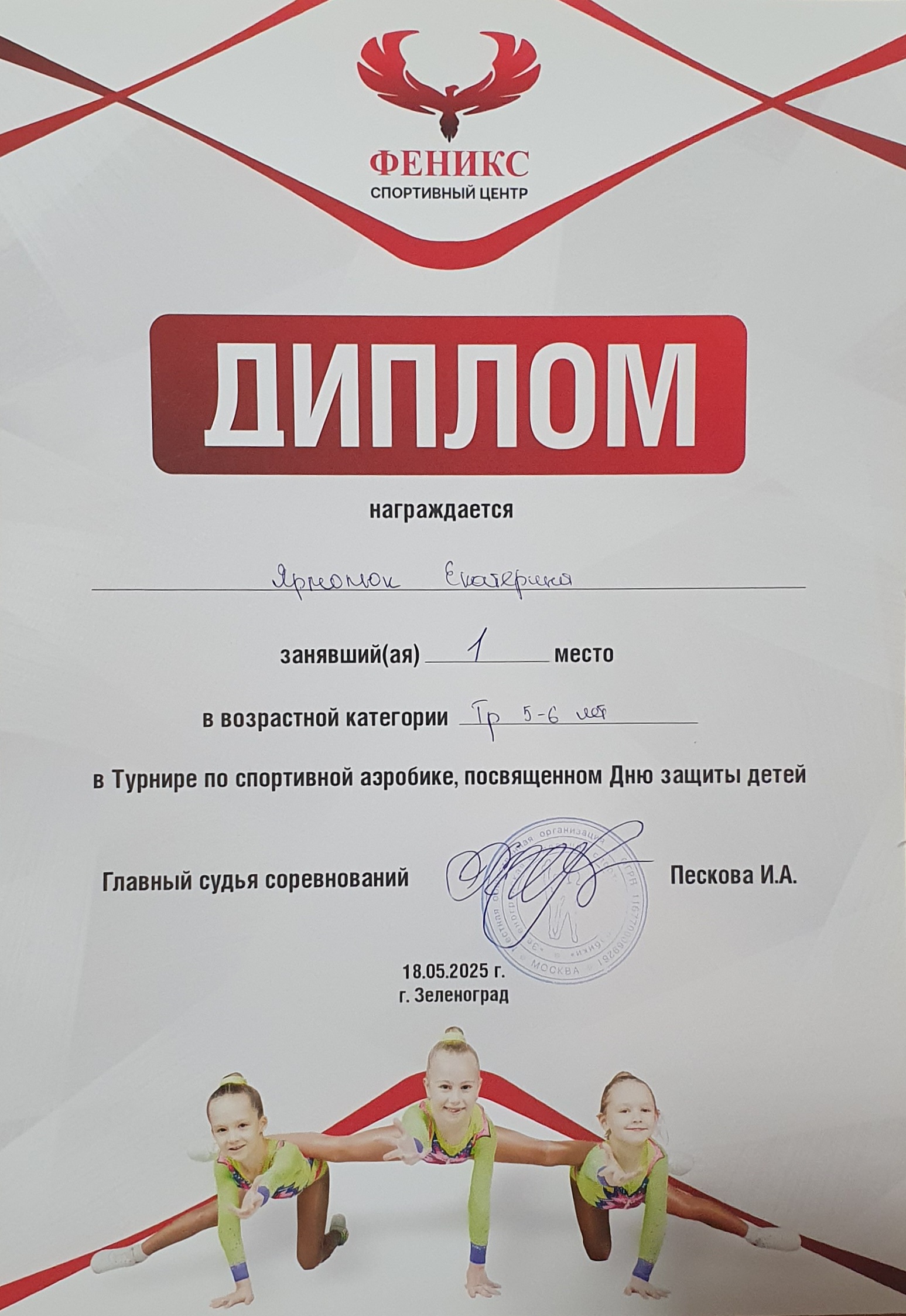 Диплом за 1 место в Турнире по спортивной аэробике, посвященном Дню защиты детей, в возрастной категории ТР 5-6 лет, г. Зеленоград, 18.05.2025 г. Организатор: Зеленоградская федерация спортивной аэробики.
