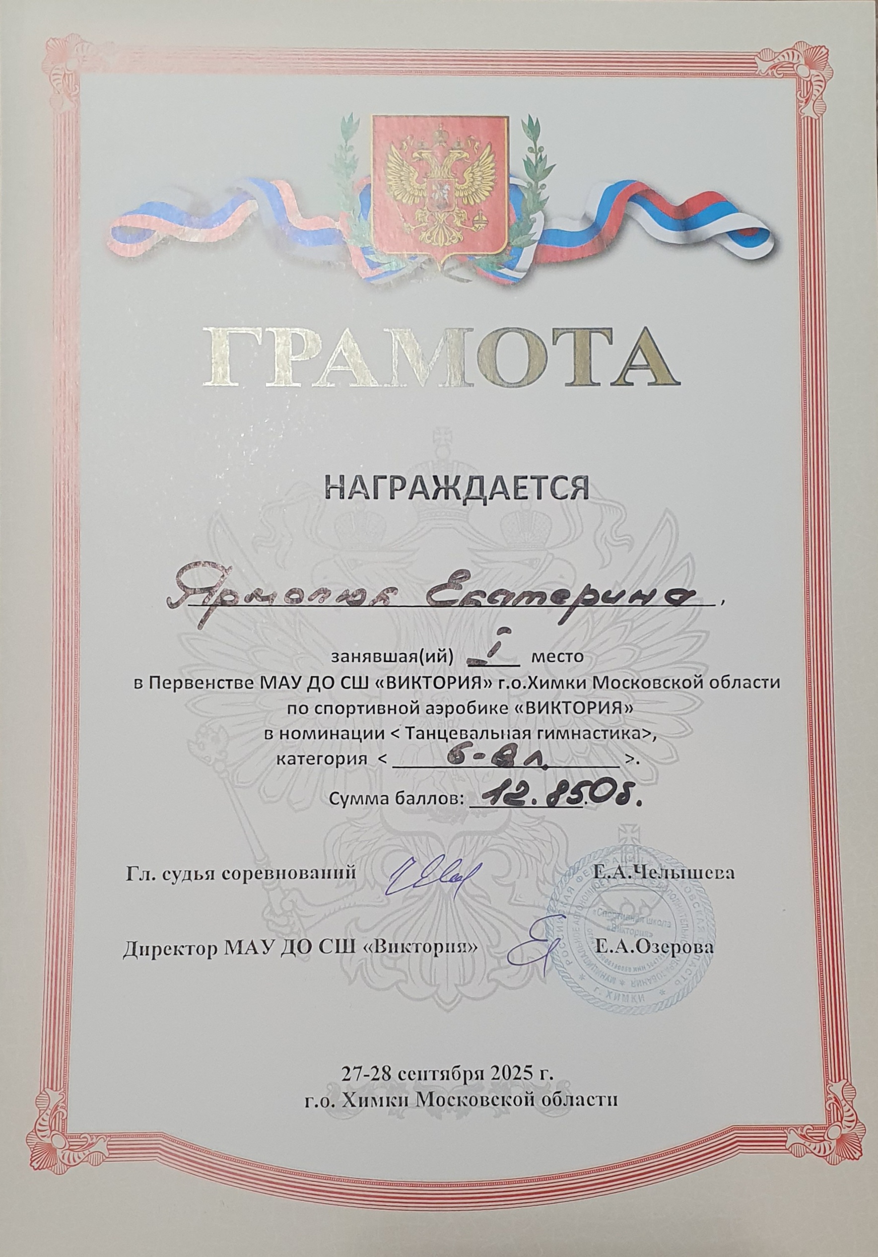 Грамота за 1 место в Первенстве МАУ ДО СШ "Виктория" г.о. Химки Московской области по спортивной аэробике "ВИКТОРИЯ" в номинации "танцевальная гимнастика" категория 6-8 л. Г.о. Химки Московской области, 27-28 сентября 2025 г.