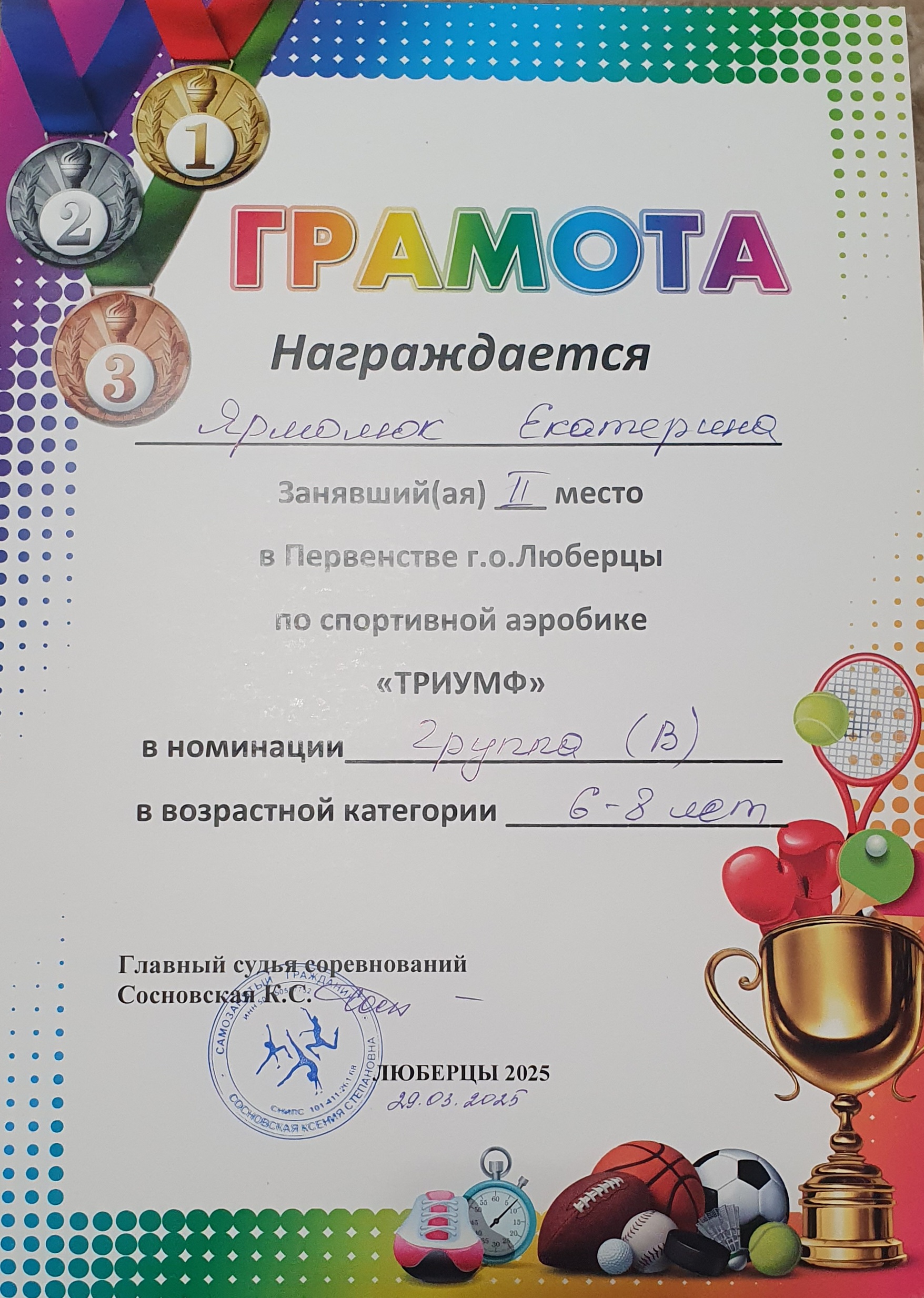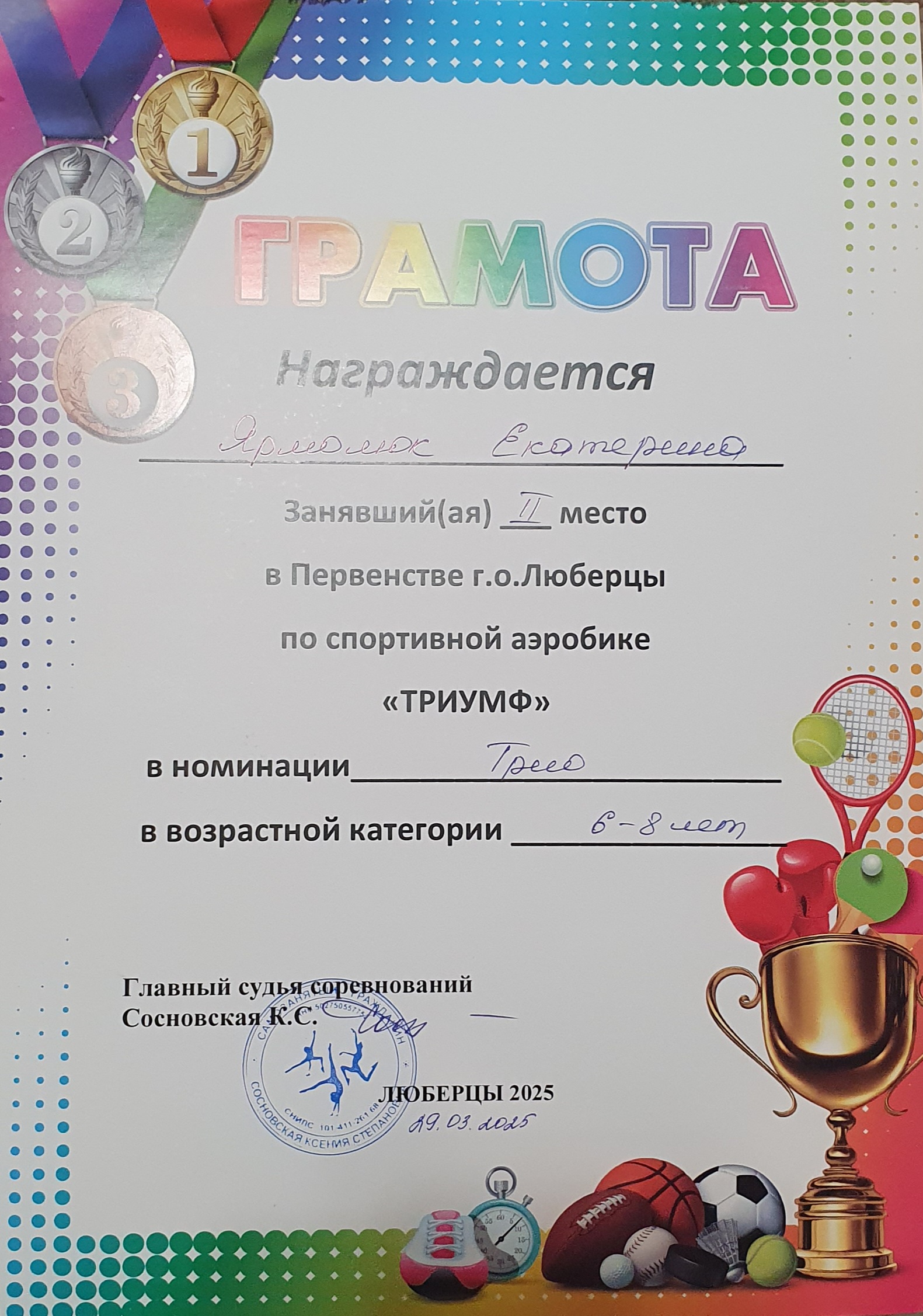 Грамота за 2 место в Первенстве г.о. Люберцы по спортивной аэробике "ТРИУМФ" в номинации Трио в возрастной категории 6-8 лет. Люберцы, 29.03.2025
