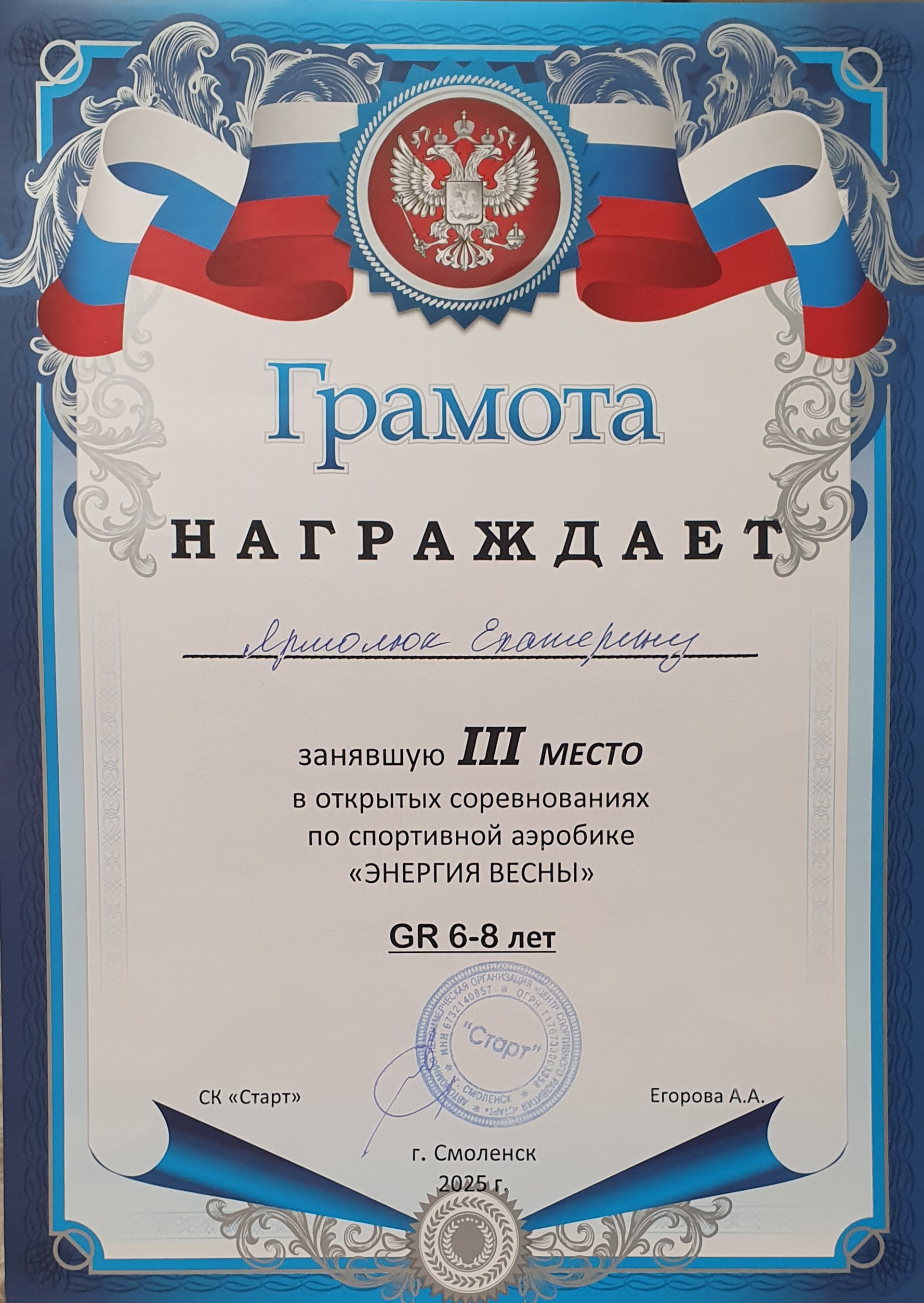 Грамота за 3 место в открытых соревнованиях по спортивной аэробике "ЭНЕРГИЯ ВЕСНЫ" в номинации GR 6-8 лет, 15.04.2025, г. Смоленск.