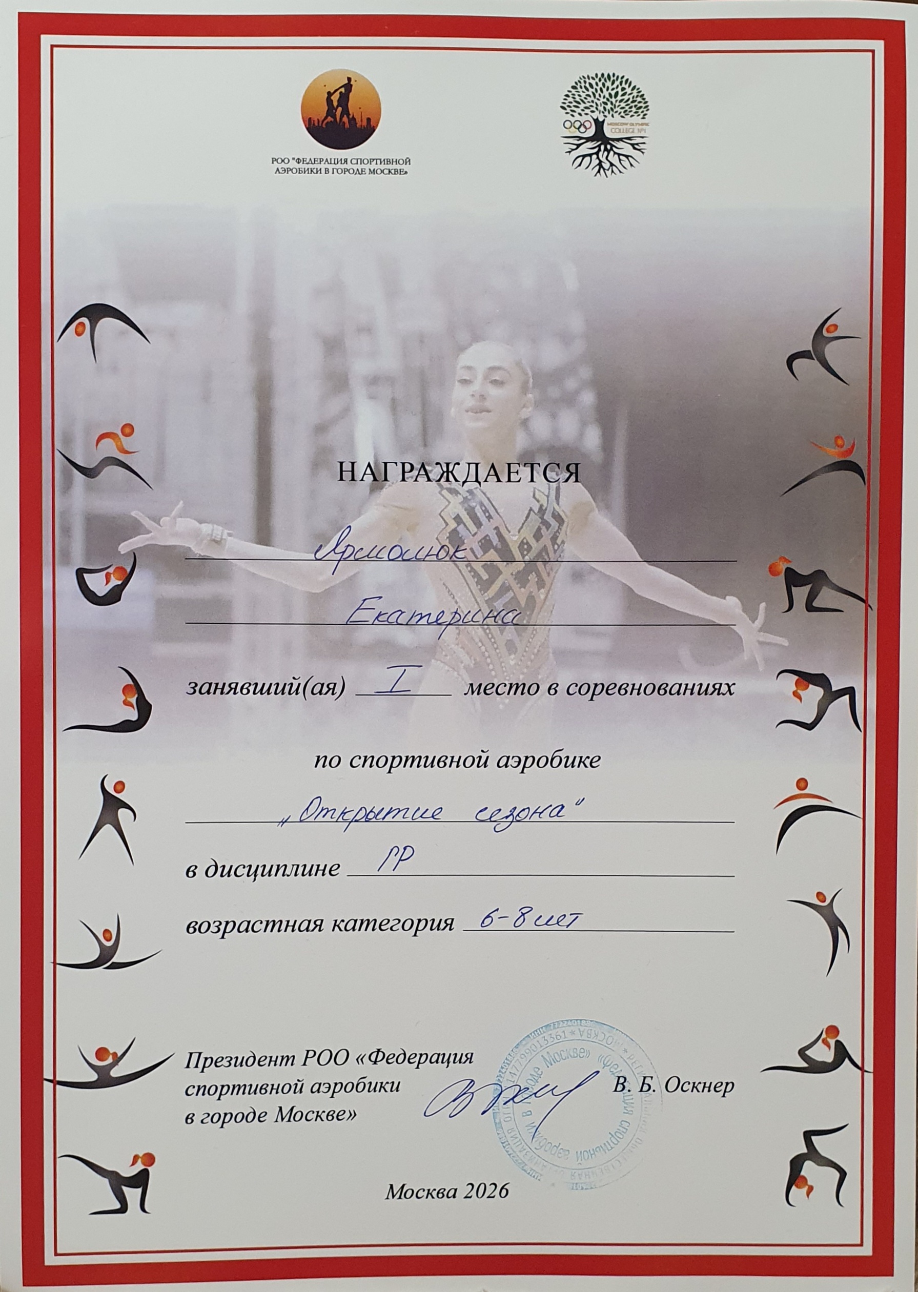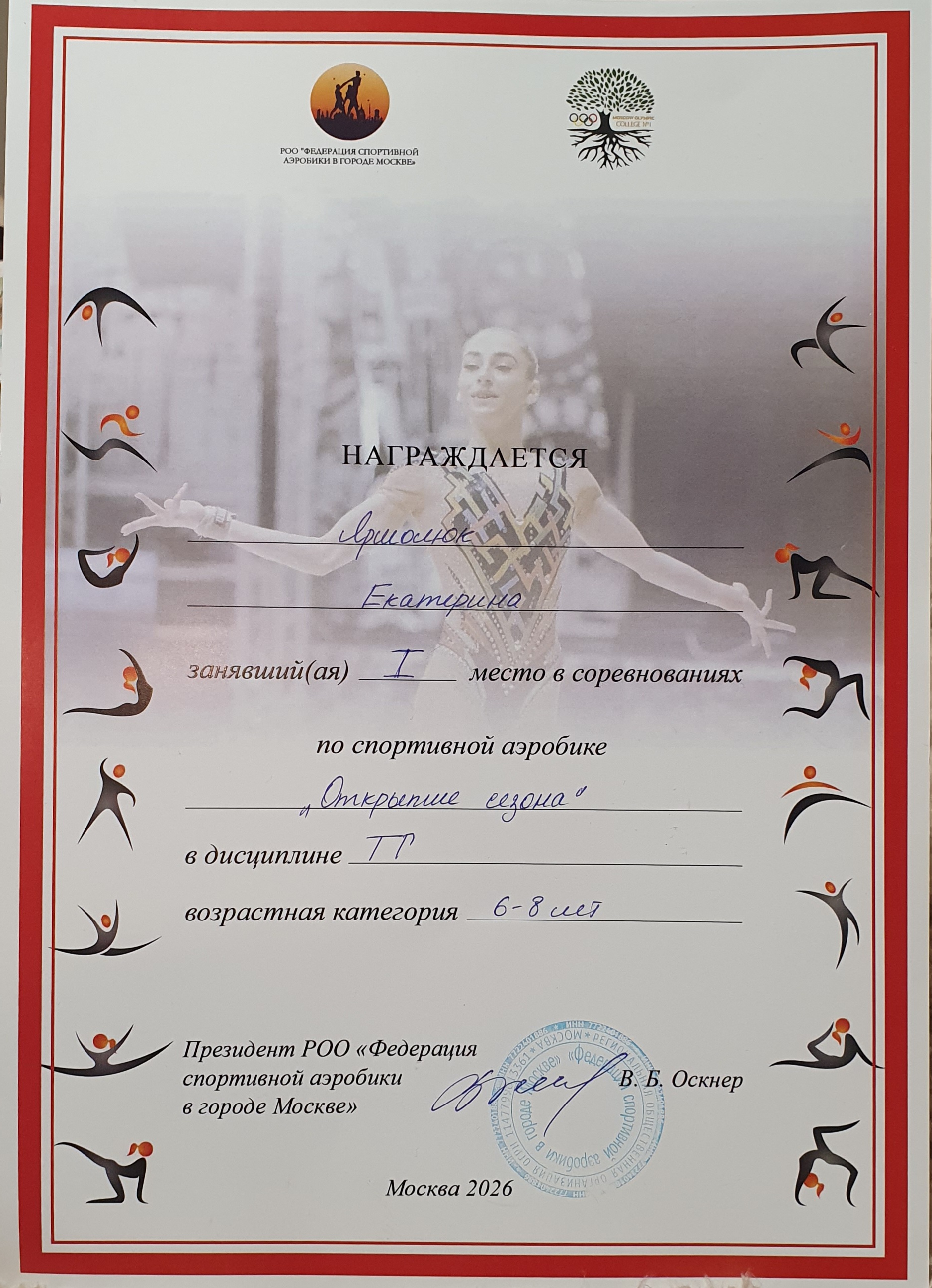 1 место в соревнованиях по спортивной аэробике "Открытие сезона" в дисциплине ГР 6-8 лет, г. Москва, 01.02.2026