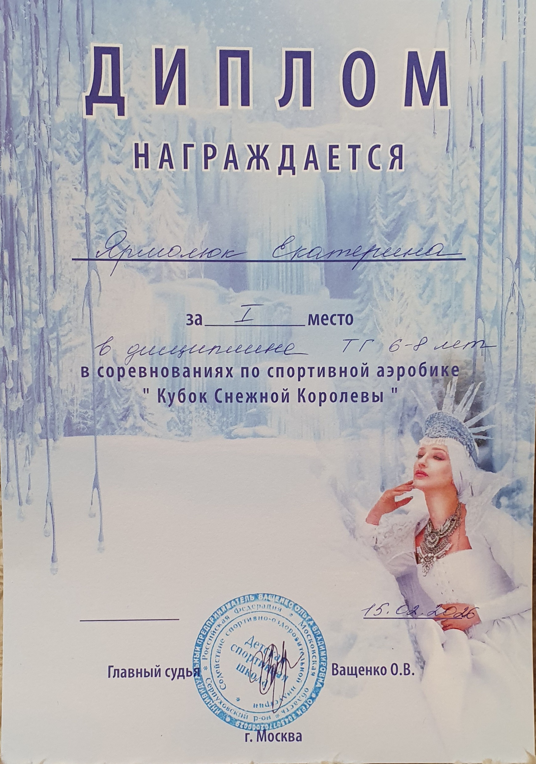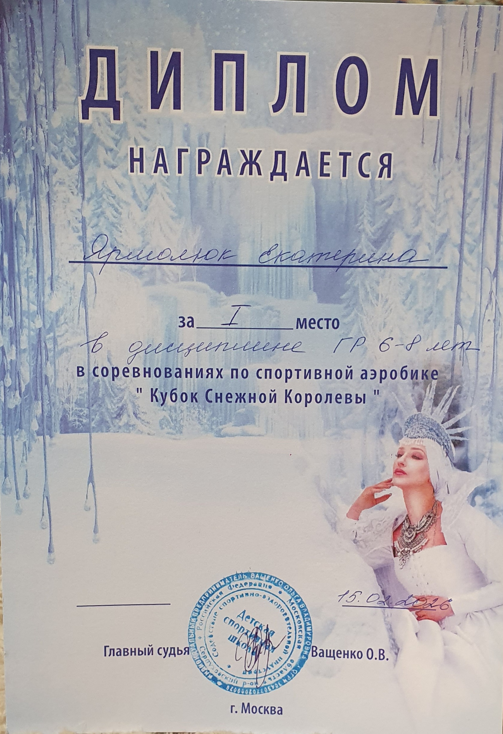 Диплом за 1 место в дисциплине ТГ 6-8 лет в соревнованиях по спортивной аэробике "Кубок Снежной Королевы", г. Москва, 15.02.2026