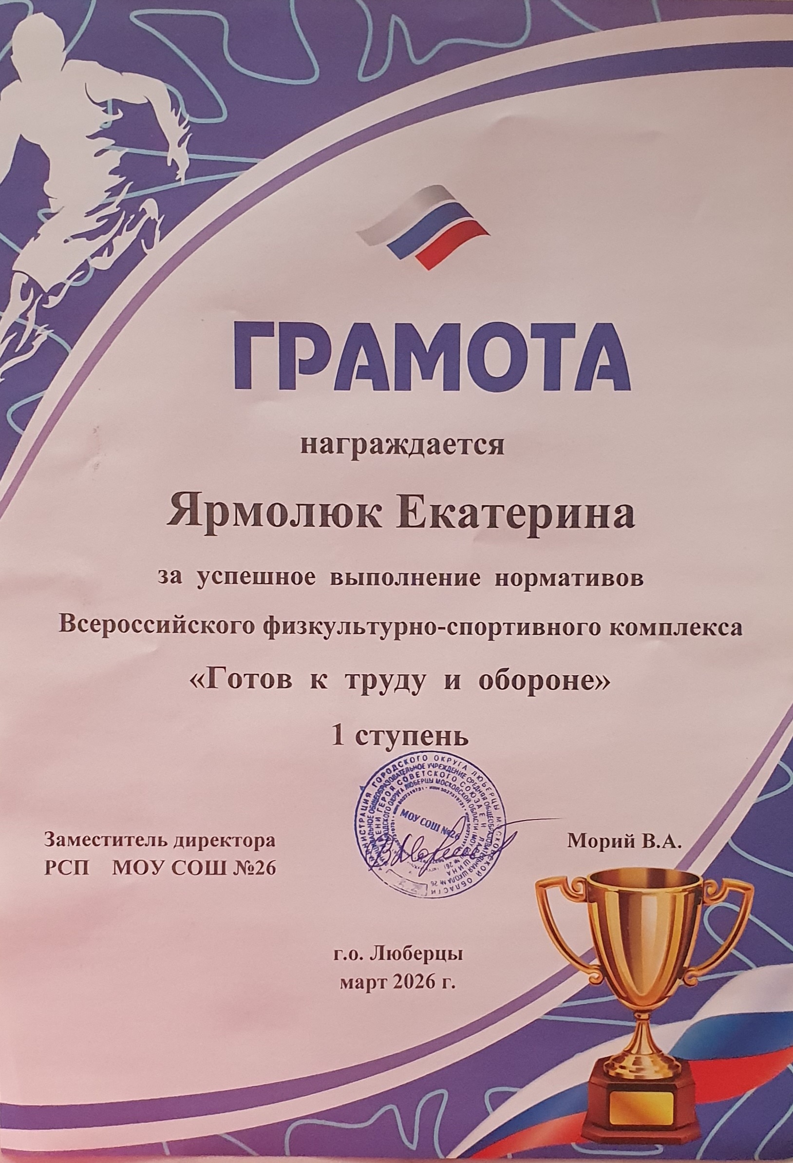 Грамота за выполнение нормативов ГТО 1 ступень , г. Люберцы, март 2026 год