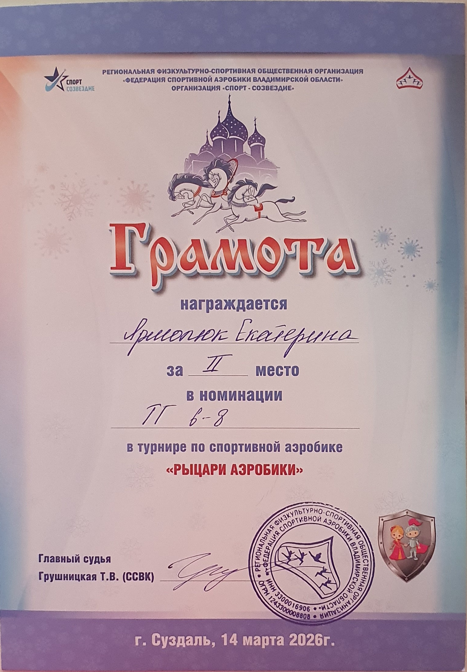 Грамота за 3 место в турнире по спортивной аэробике "Рыцари аэробики" в номинации группы, возрастная категория 6-8 лет, г. Суздаль, 02-03 марта 2025 г.