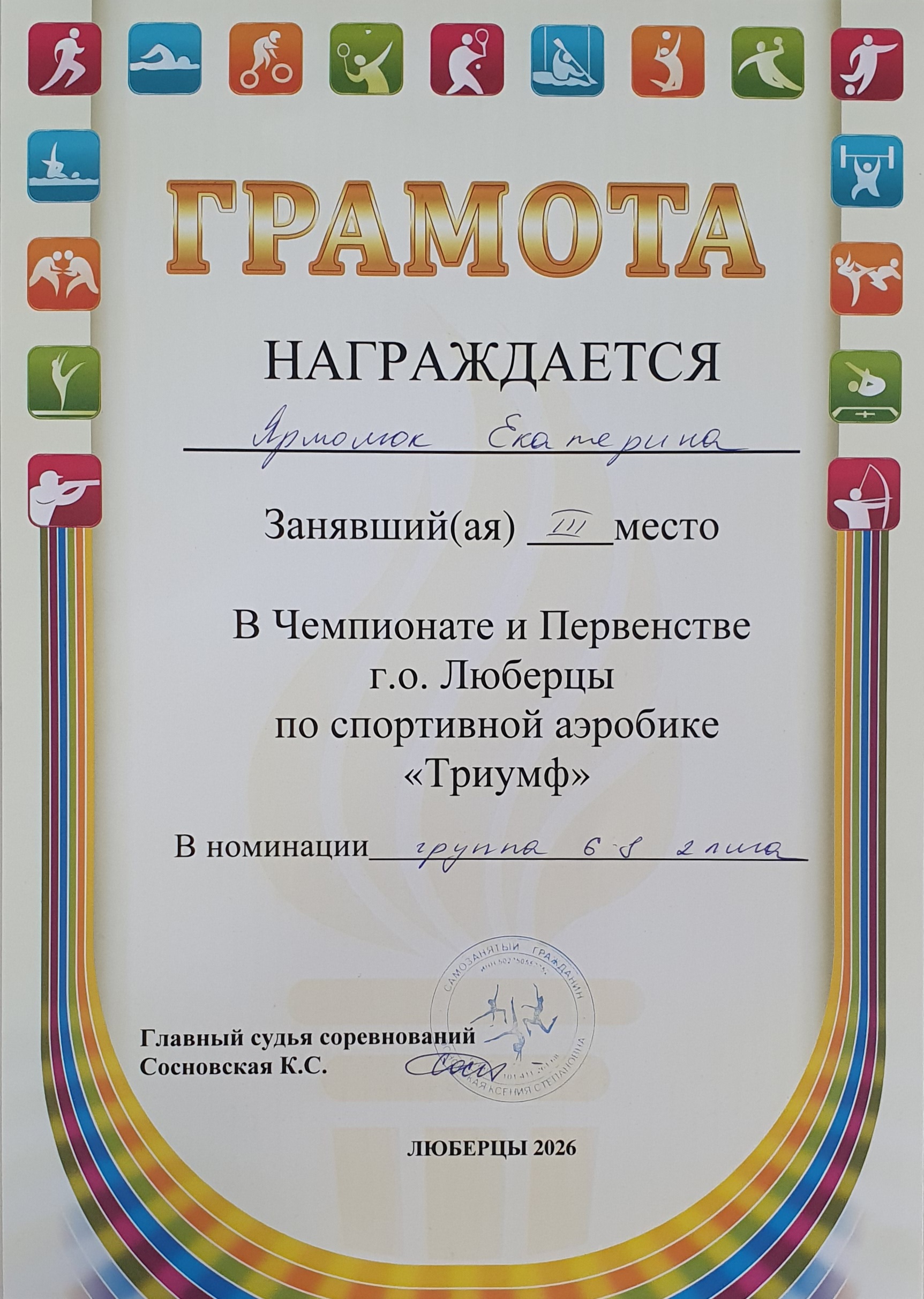 Грамота за 3 место в Чемпионате и Первенстве г.о. Люберцы по спортивной аэробике "Триумф" в номинации Группа 6-8 лига 2, г. Люберцы, 28.03.2026
