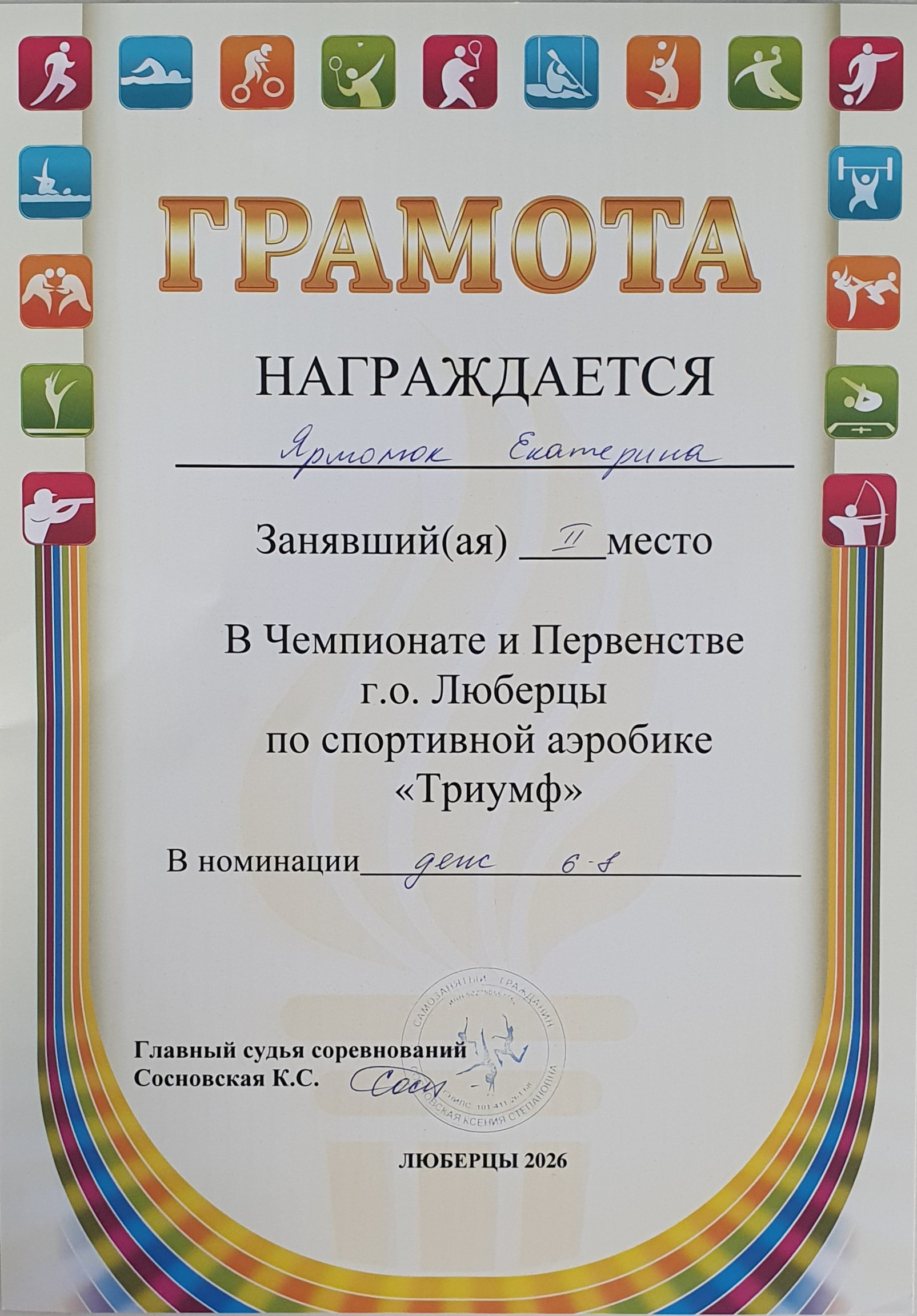 Грамота за 2 место в Чемпионате и Первенстве г.о. Люберцы по спортивной аэробике "Триумф" в номинации Денс 6-8, г. Люберцы, 28.03.2026