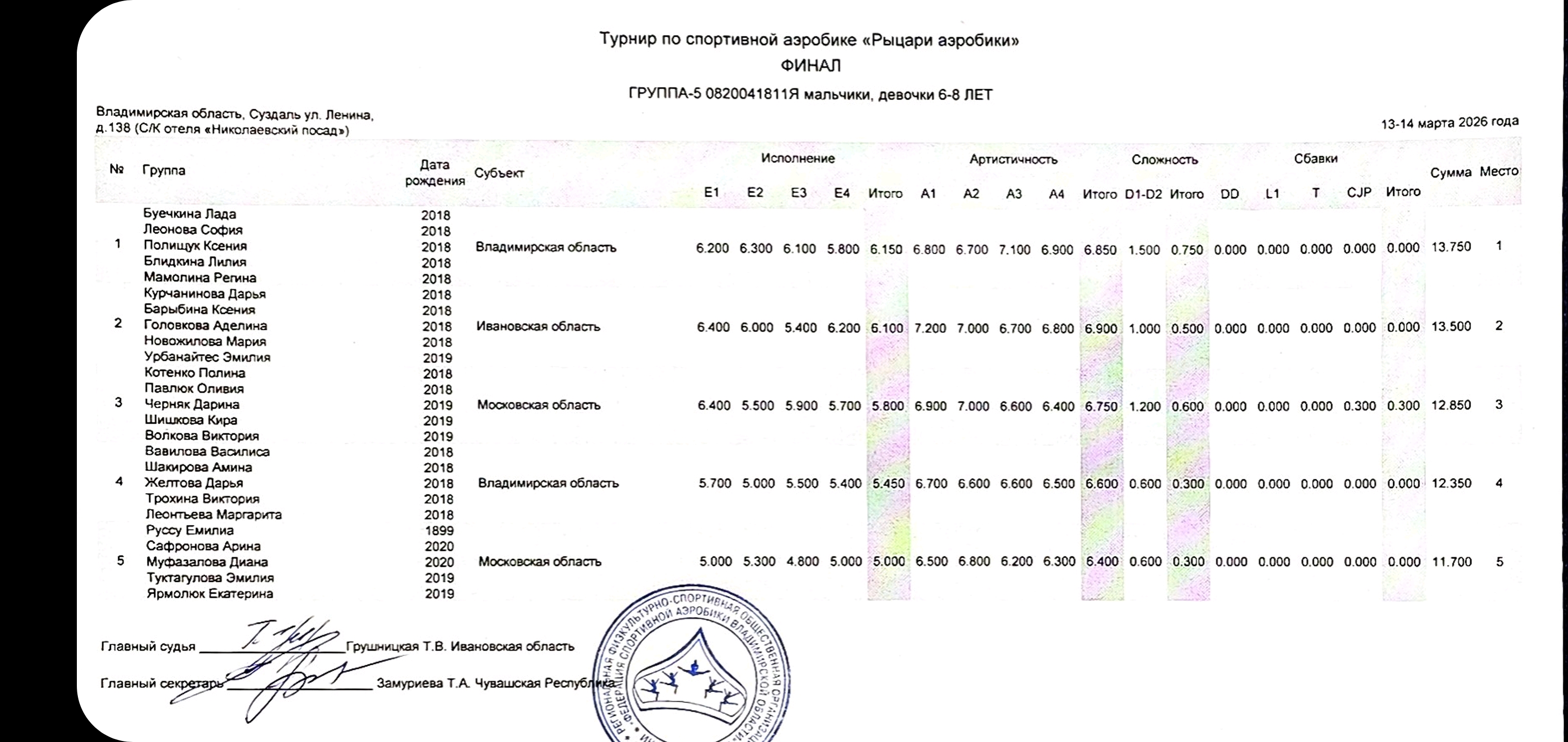 5 место в номинации Группа в категории 6-8 лет в турнире по спортивной аэробике "Рыцари аэробики", г. Суздаль, 13.03.2026