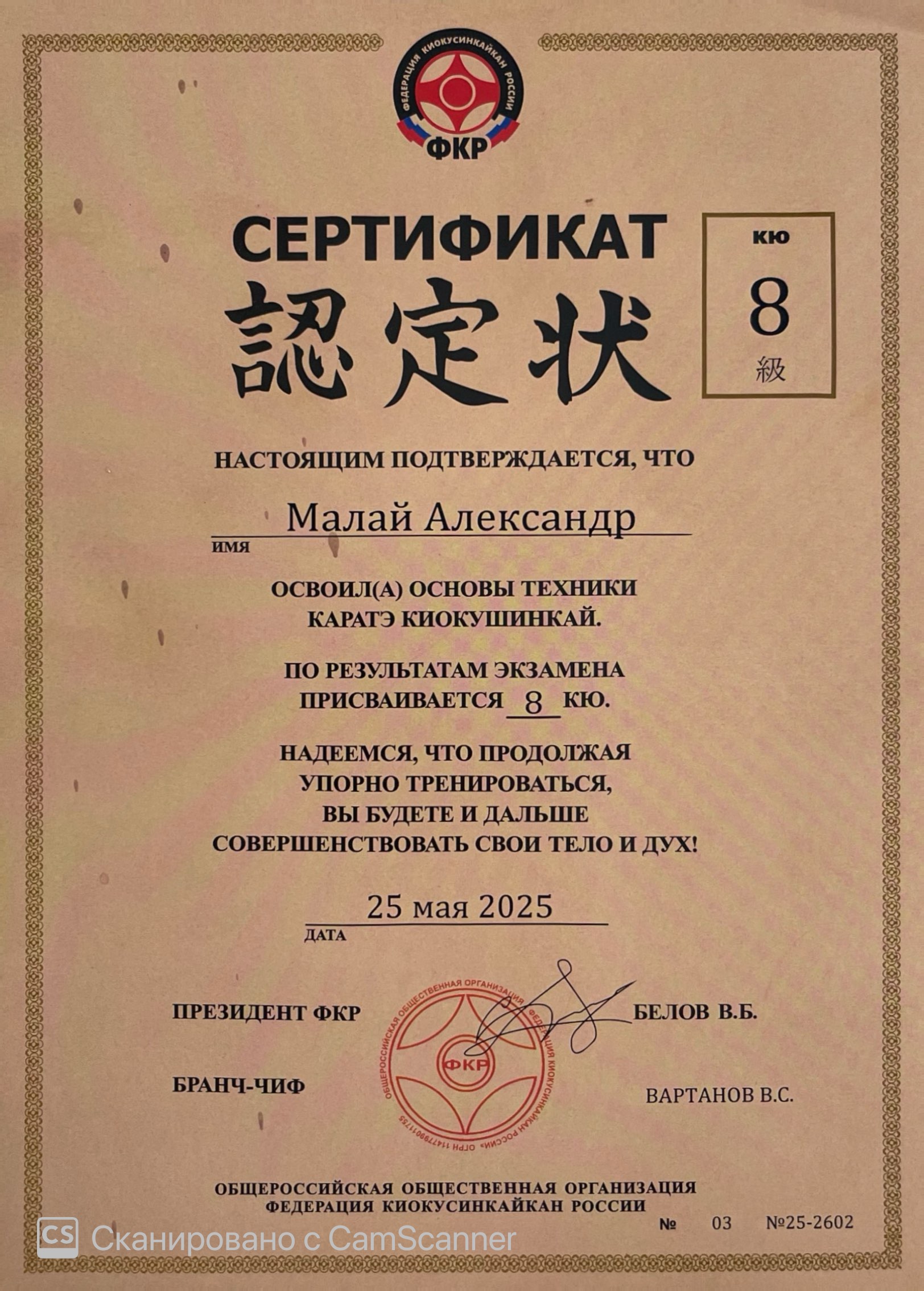 СЕРТИФИКАТ подтверждающий что Малай Александр освоил основы техники Каратэ Киокушинкай.