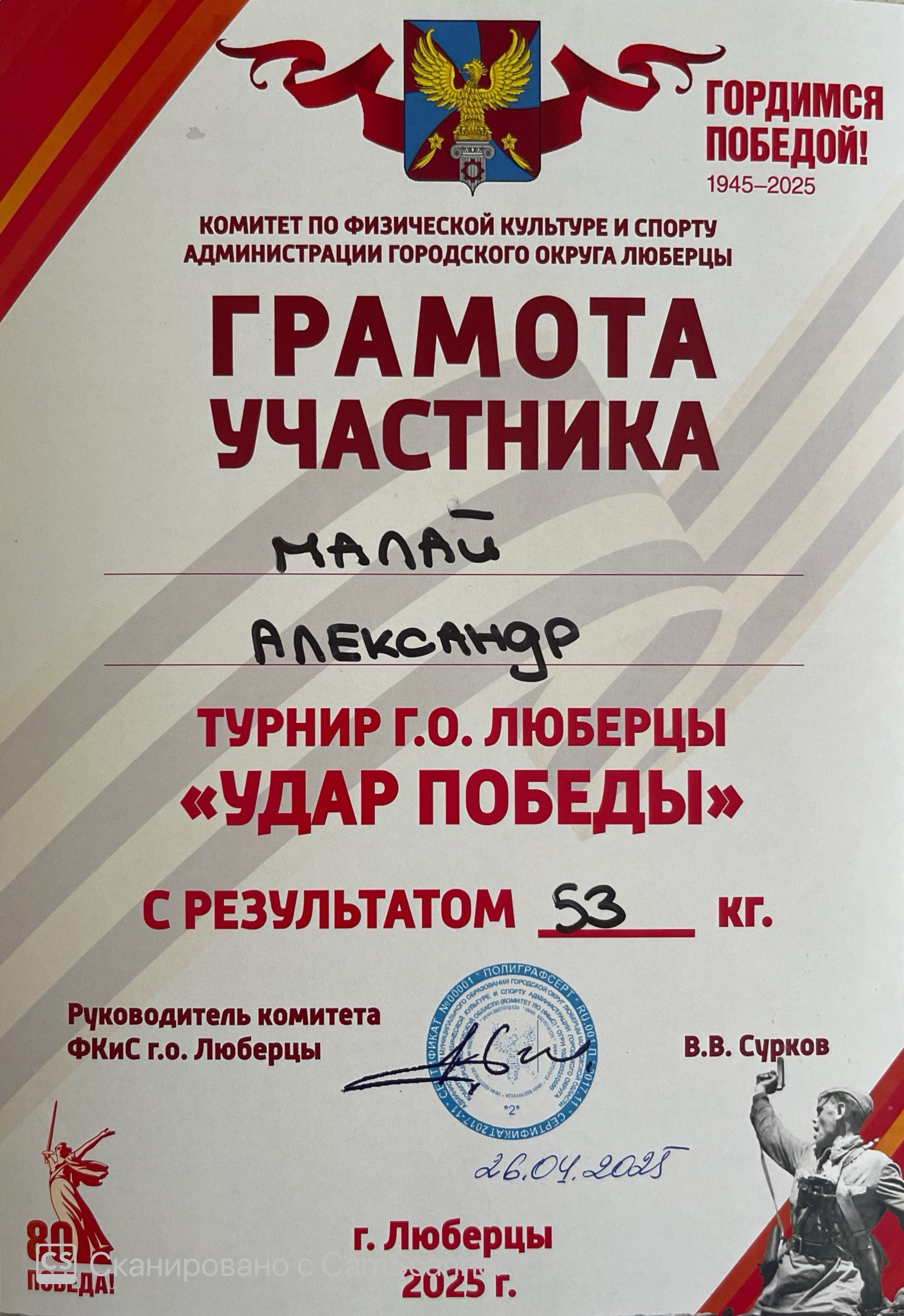 Грамота участника ТУРНИР Г.О. ЛЮБЕРЦЫ "УДАР ПОБЕДЫ" с результатом 53 кг.