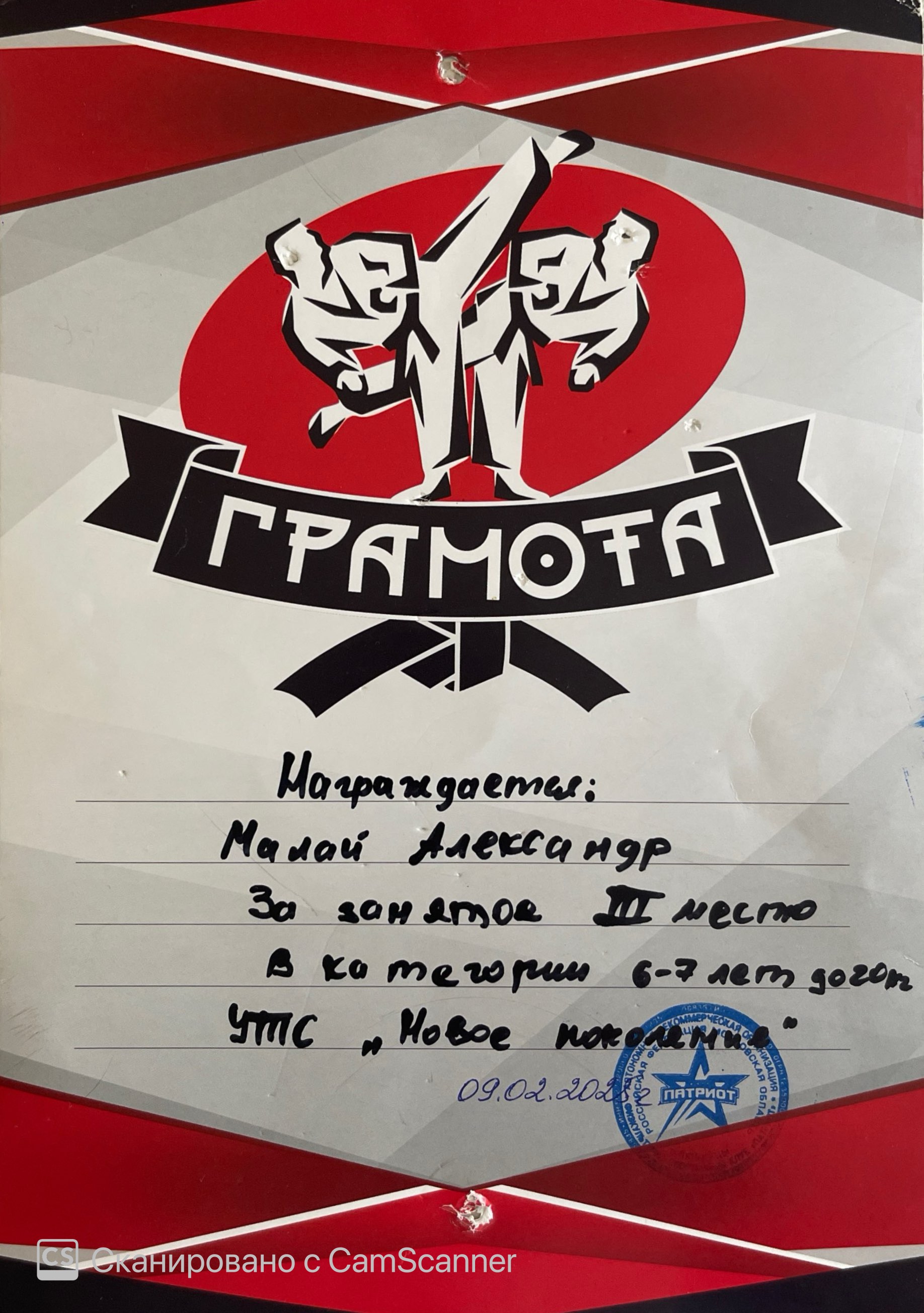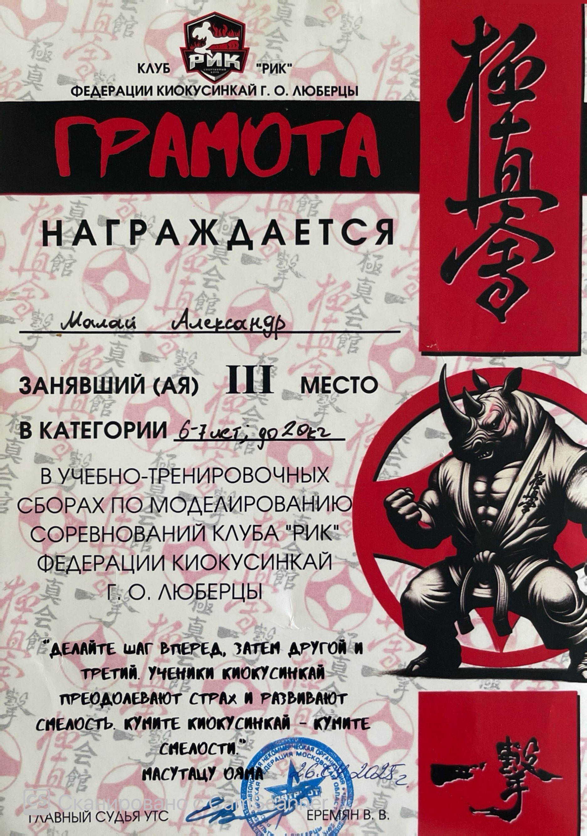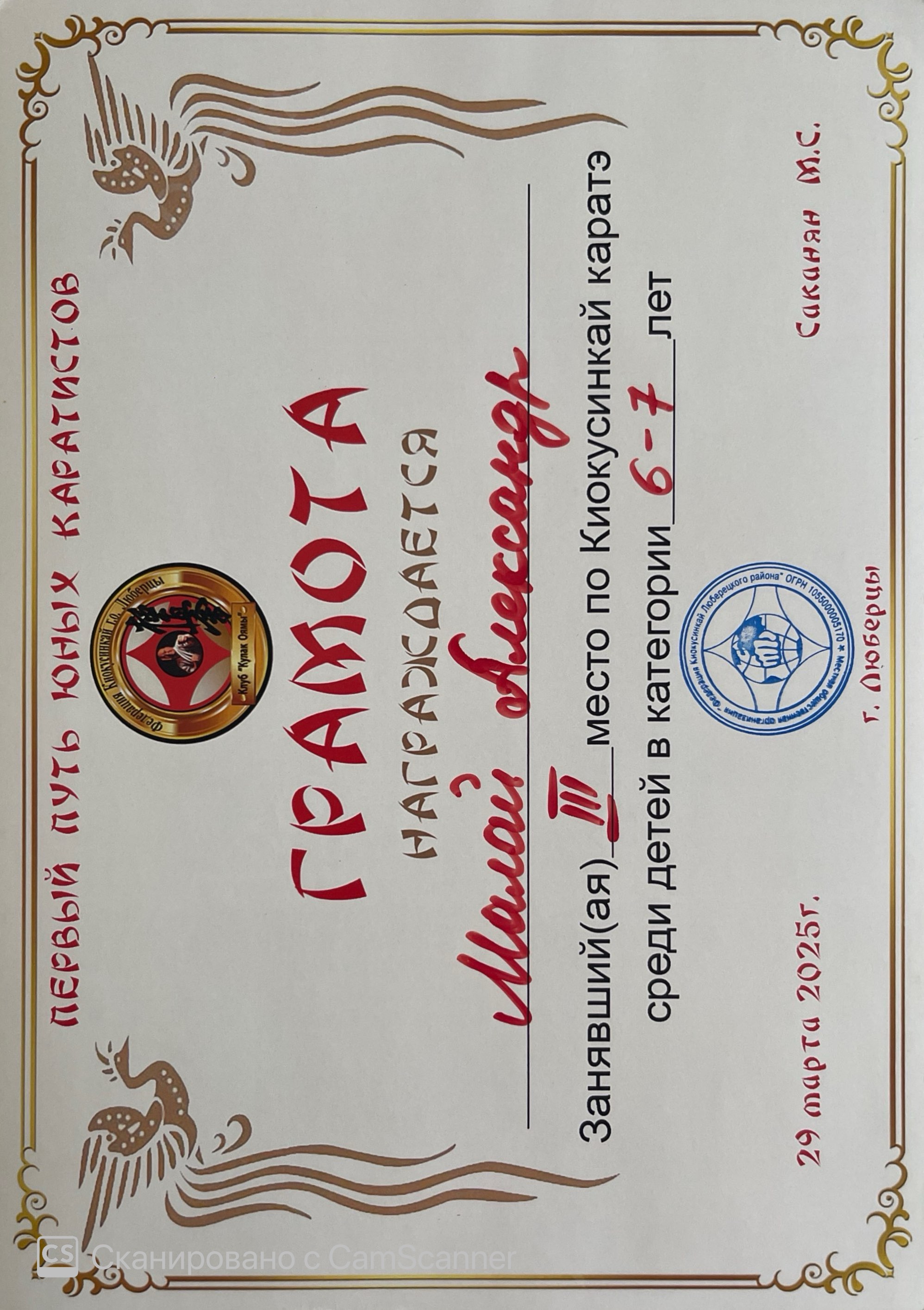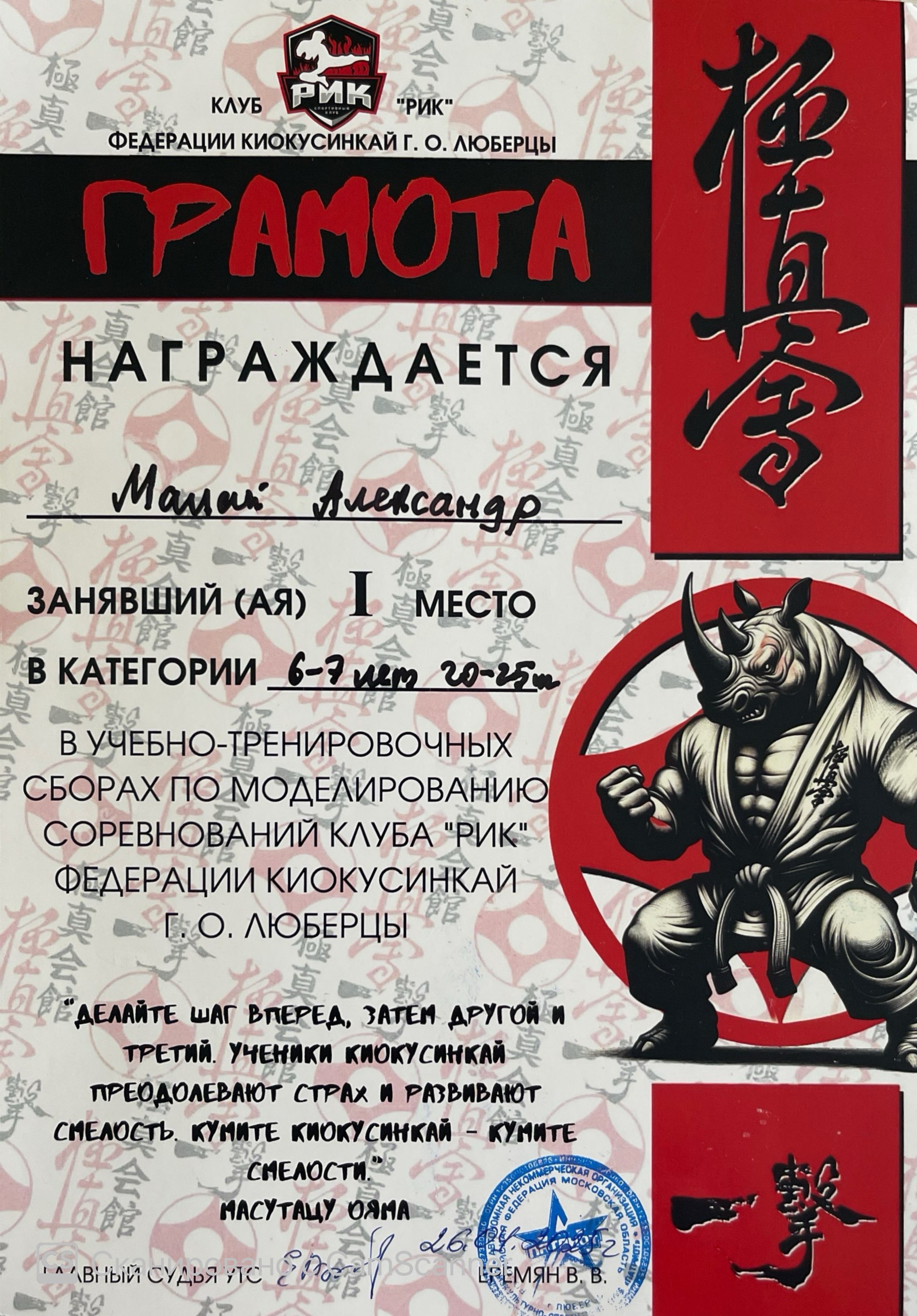Грамота за 3 место в категории 6-7 лет до 20 кг В УЧЕБНО- ТРЕНИРОВОЧНЫХ СБОРАХ ПО МОДЕЛИРОВАНИЮ СОРЕВНОВАНИЙ КЛУБА "РИК" ФЕДЕРАЦИИ КИОКУСИНКАЙ Г.О. ЛЮБЕРЦЫ.