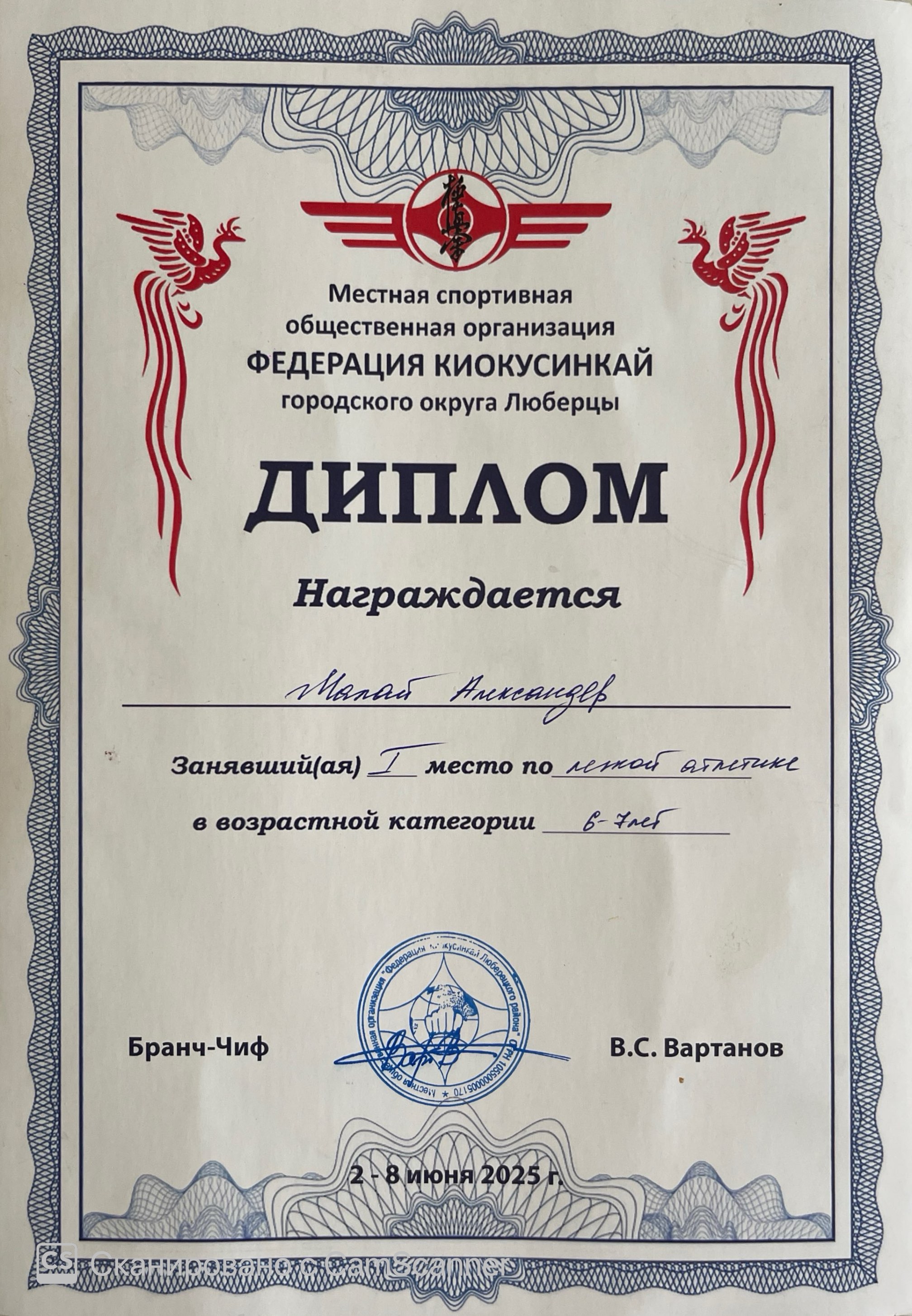 Диплом за 1 место по легкой атлетике в возрастной категории 6-7 лет.