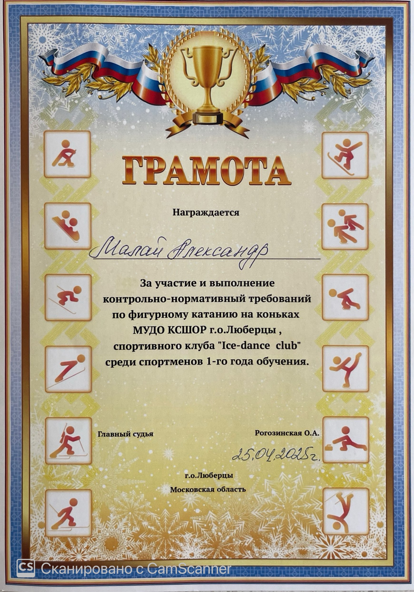Грамота за участие и выполнение контрольно-нормативных требований по фигурному катанию на коньках МУДО КСШОР г.о. Люберцы, спортивного клуба "Ice-dance club" среди спортсменов 1-го года обучения. г.о. Люберцы, Московская область, 25.04.2025 г.